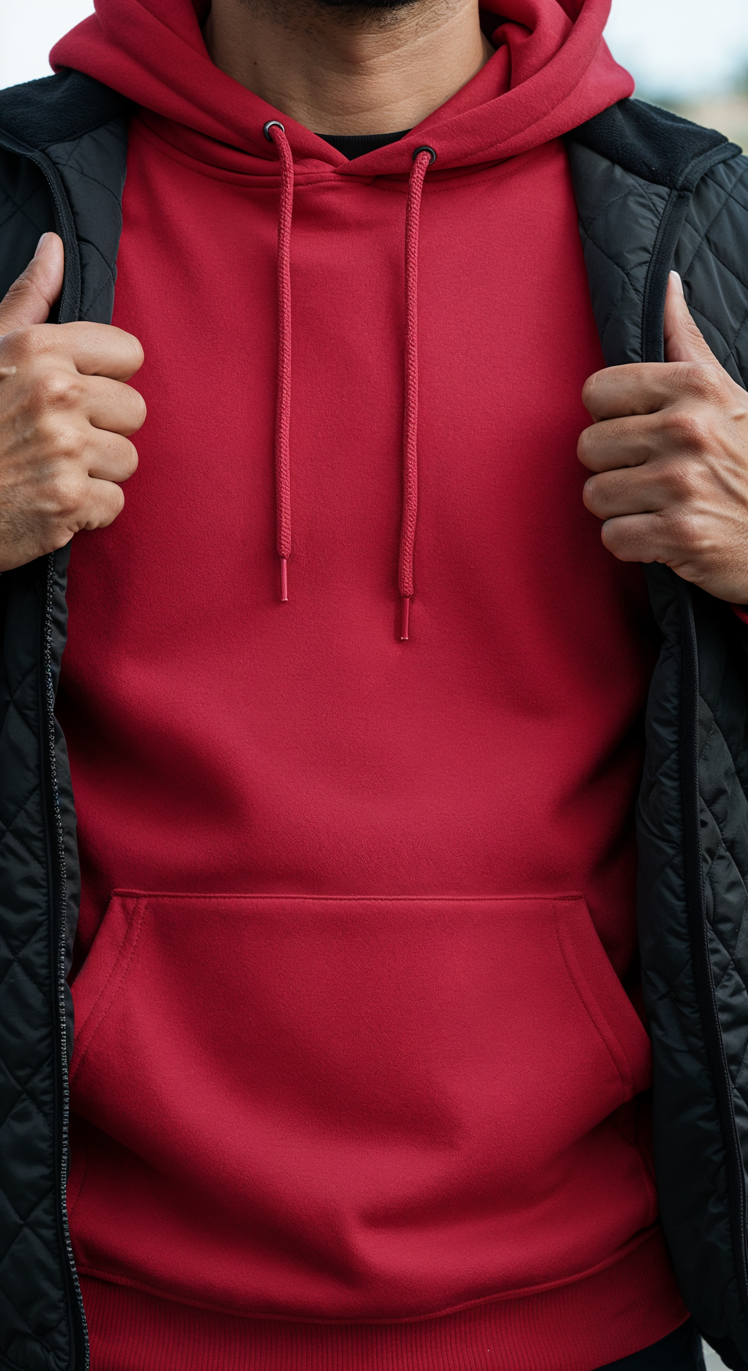 Close-up of a red hoodie with drawstrings and a black quilted jacket, perfect for layering in cool weather.