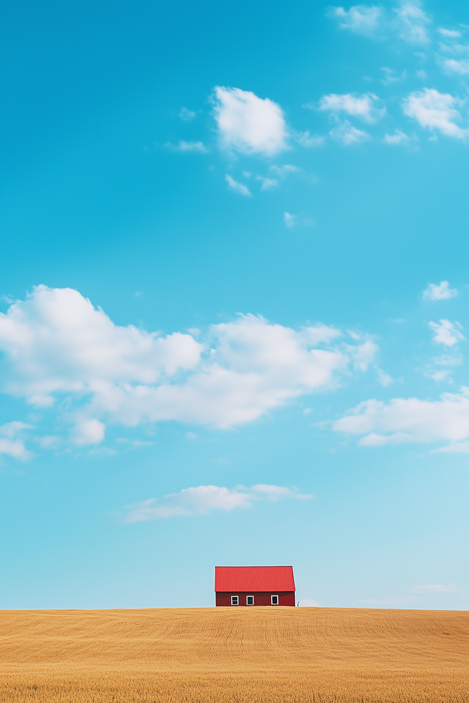 A small red house with a red roof sits in a golden wheat field under a bright blue sky with fluffy white clouds.