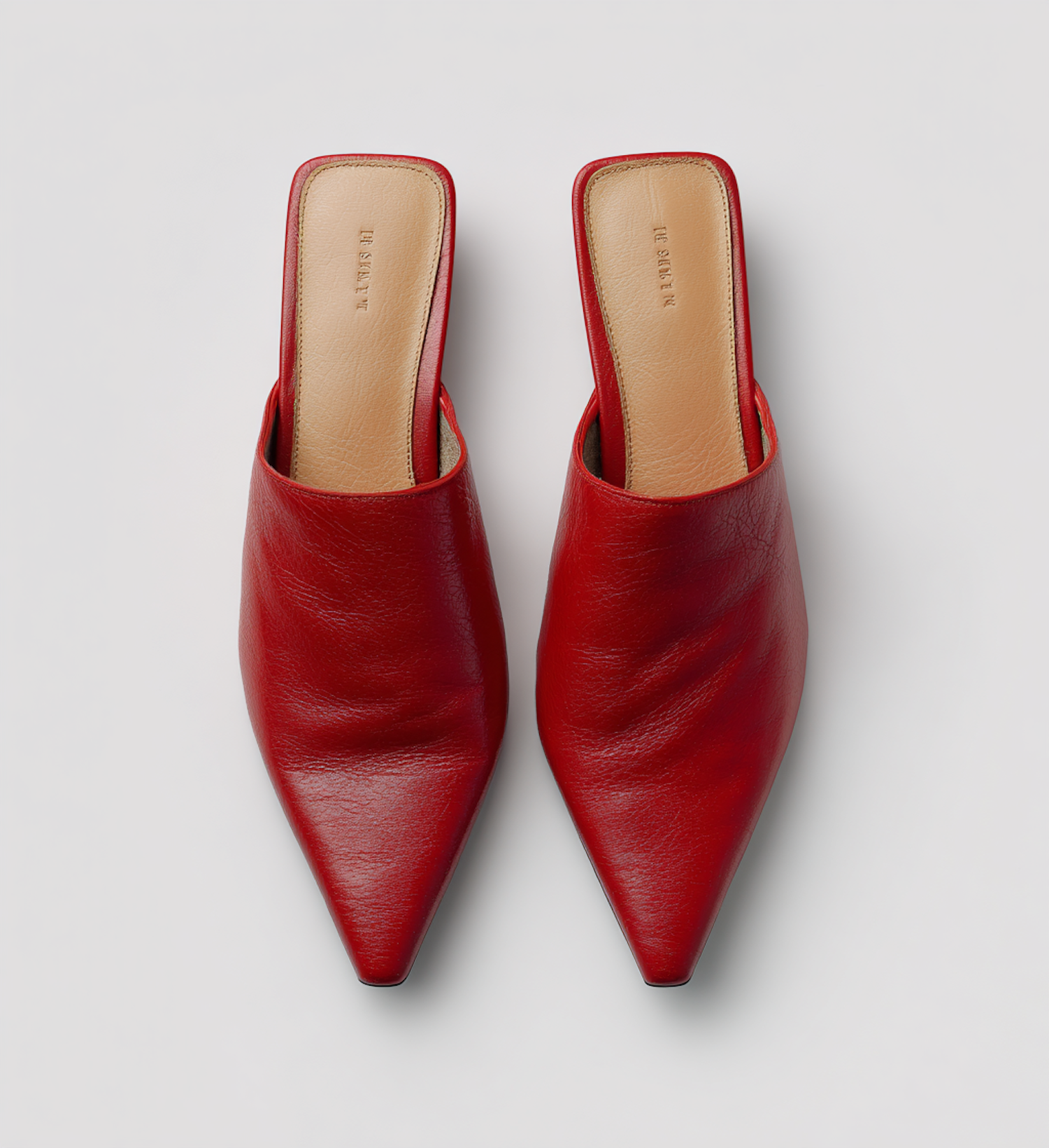 Stylish red leather mules with pointed toes and tan insoles, perfect for a chic and modern look. Ideal for casual or formal occasions.