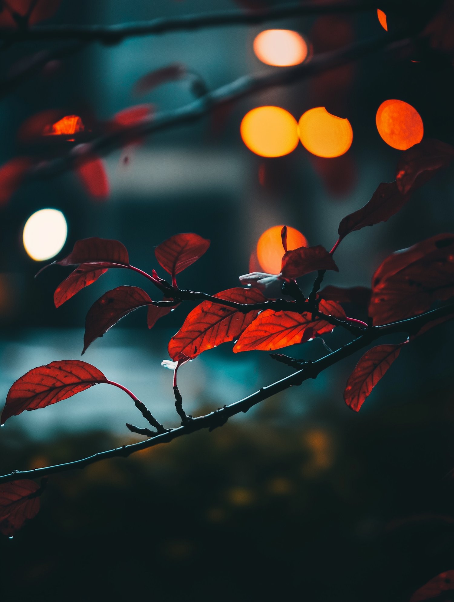 Vivid red leaves on a branch with a dreamy bokeh background of warm orange and white lights, creating a serene and moody atmosphere.