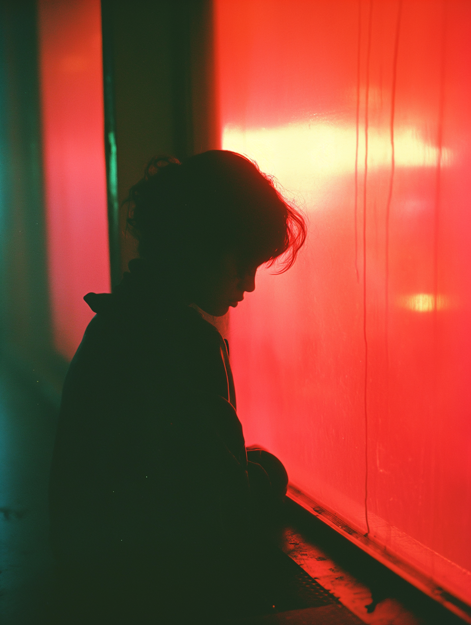 Silhouette of a person against a vibrant red and orange illuminated background, creating a dramatic and introspective mood.