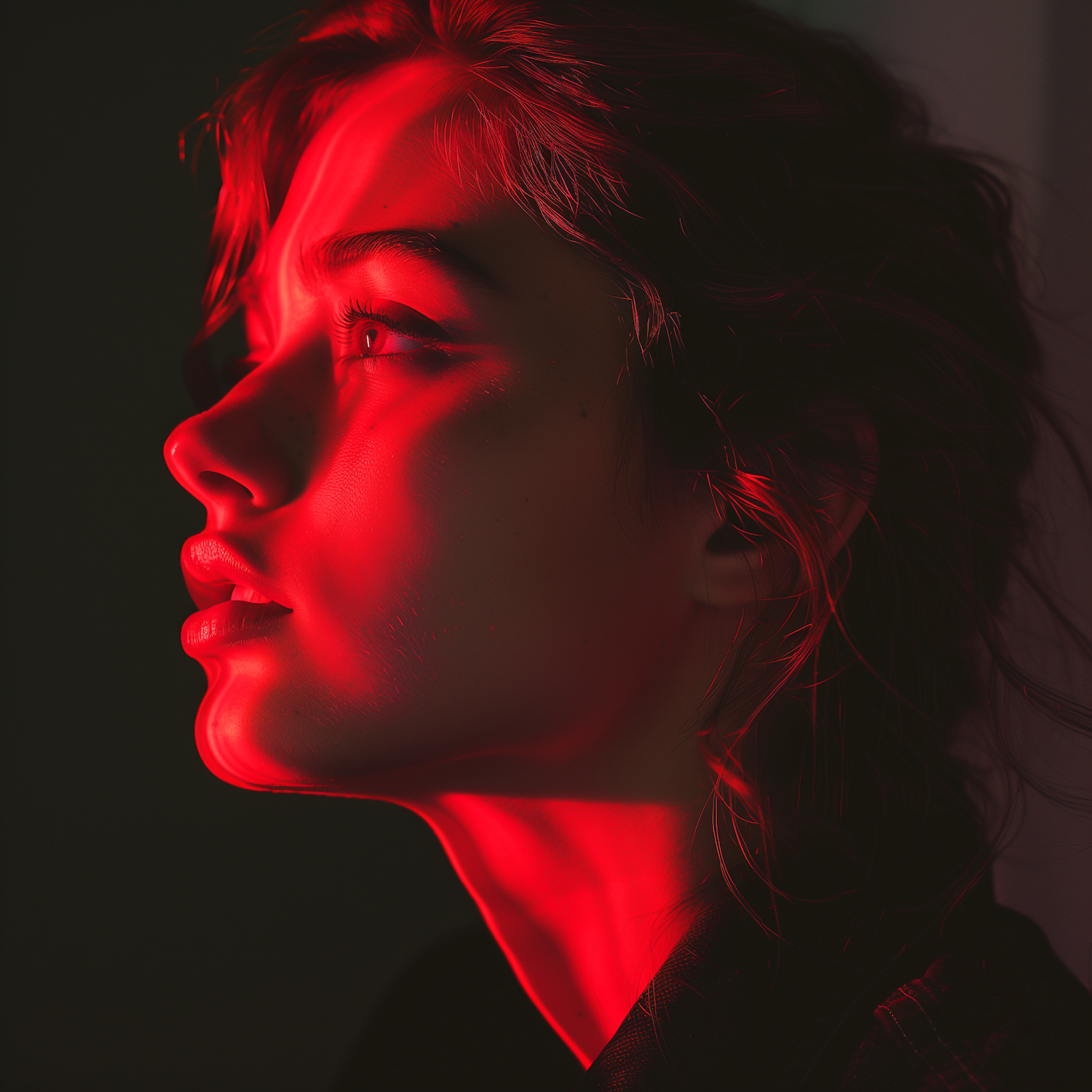 Profile of a woman in dramatic red lighting, highlighting her features against a dark background.