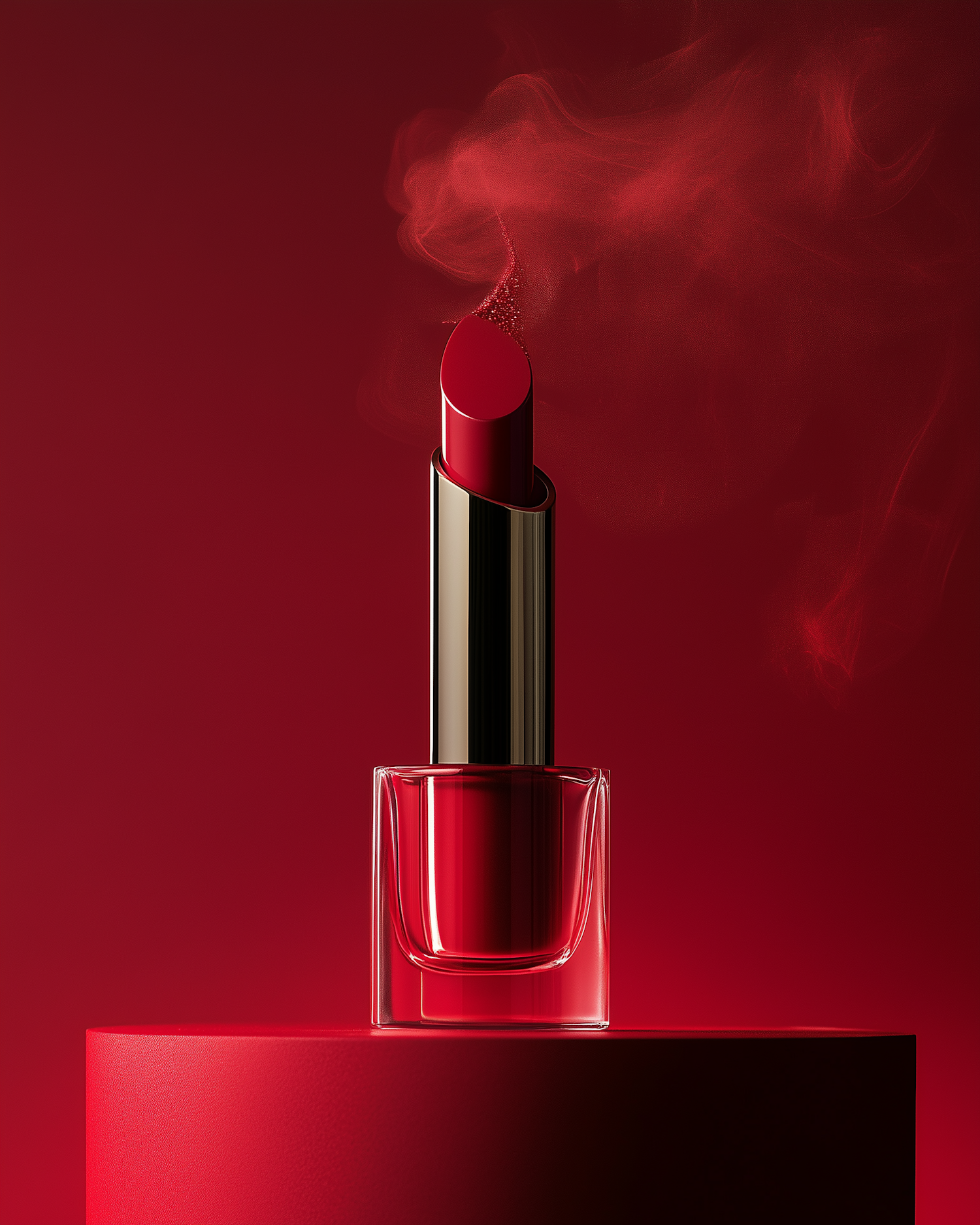Luxurious red lipstick with gold casing on a red pedestal, surrounded by a smoky red mist, exuding elegance and sophistication.