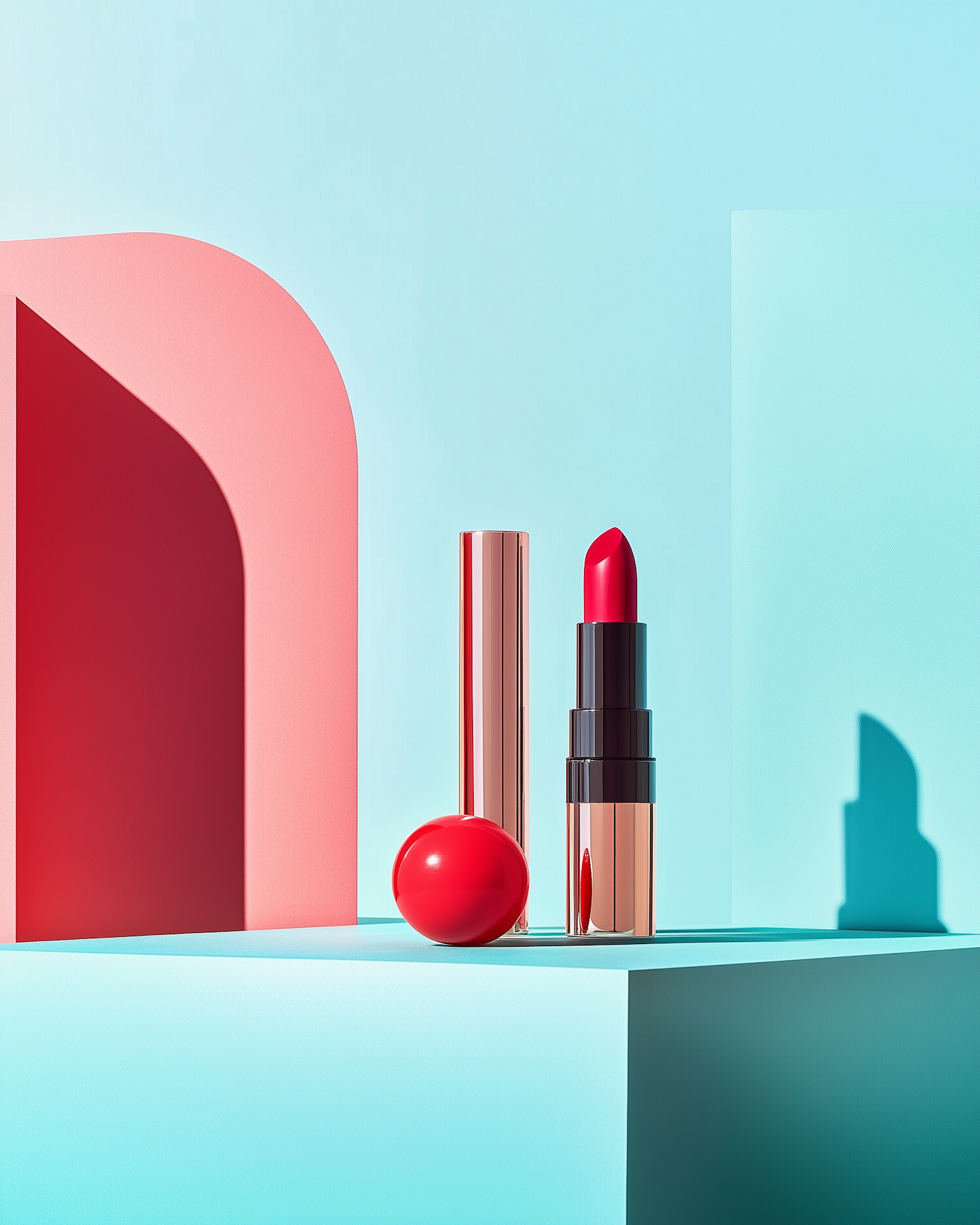 Stylish red lipstick with gold casing on a turquoise platform, paired with a coral pink and turquoise minimalist background.