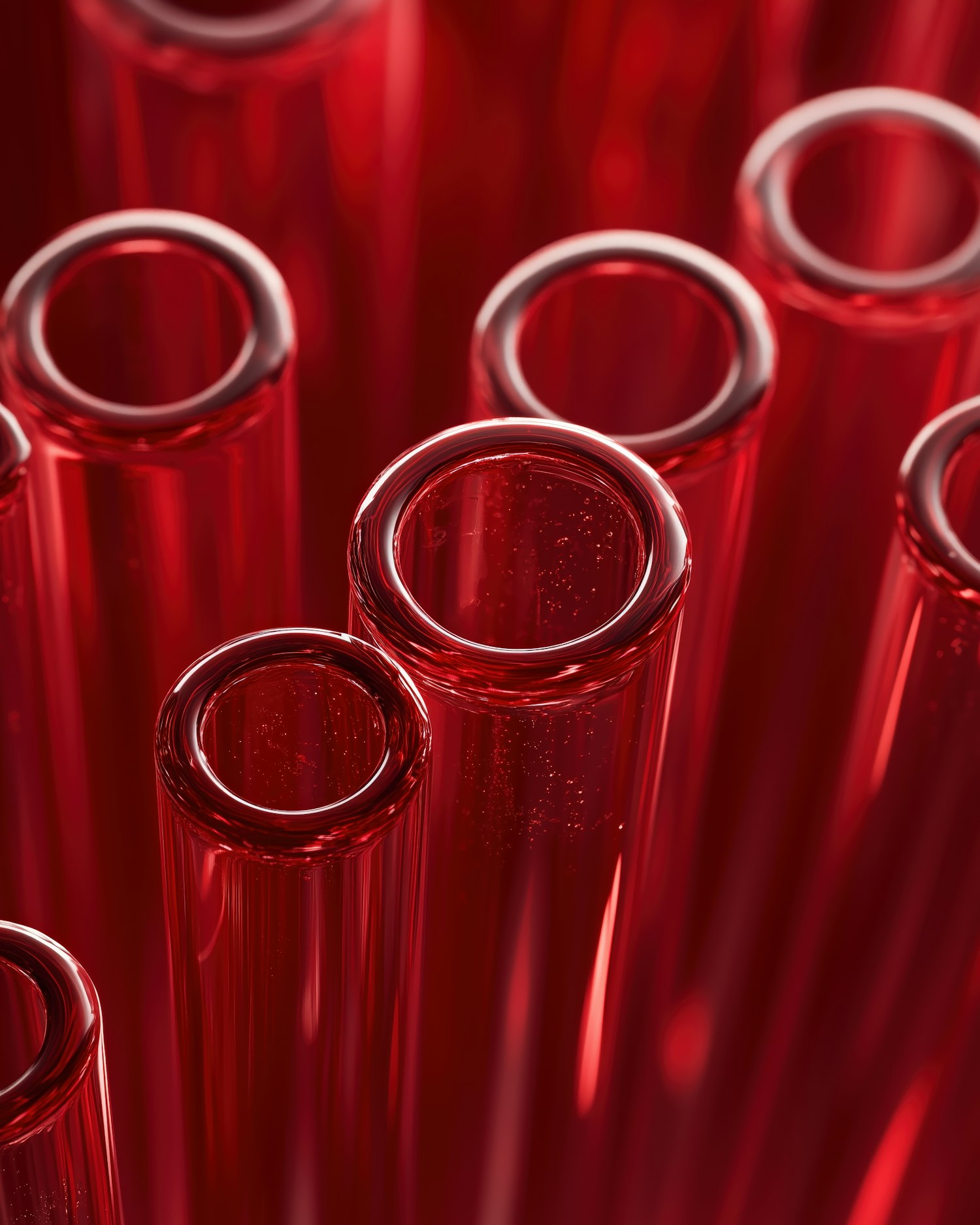 Close-up of glass test tubes filled with vivid red liquid, showcasing glossy textures, air bubbles, and a striking red background.