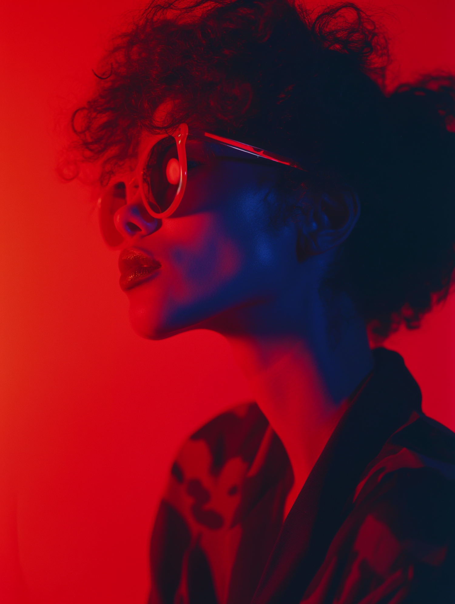 Stylish portrait in red lighting with curly-haired person wearing sunglasses, creating a bold and artistic visual effect.