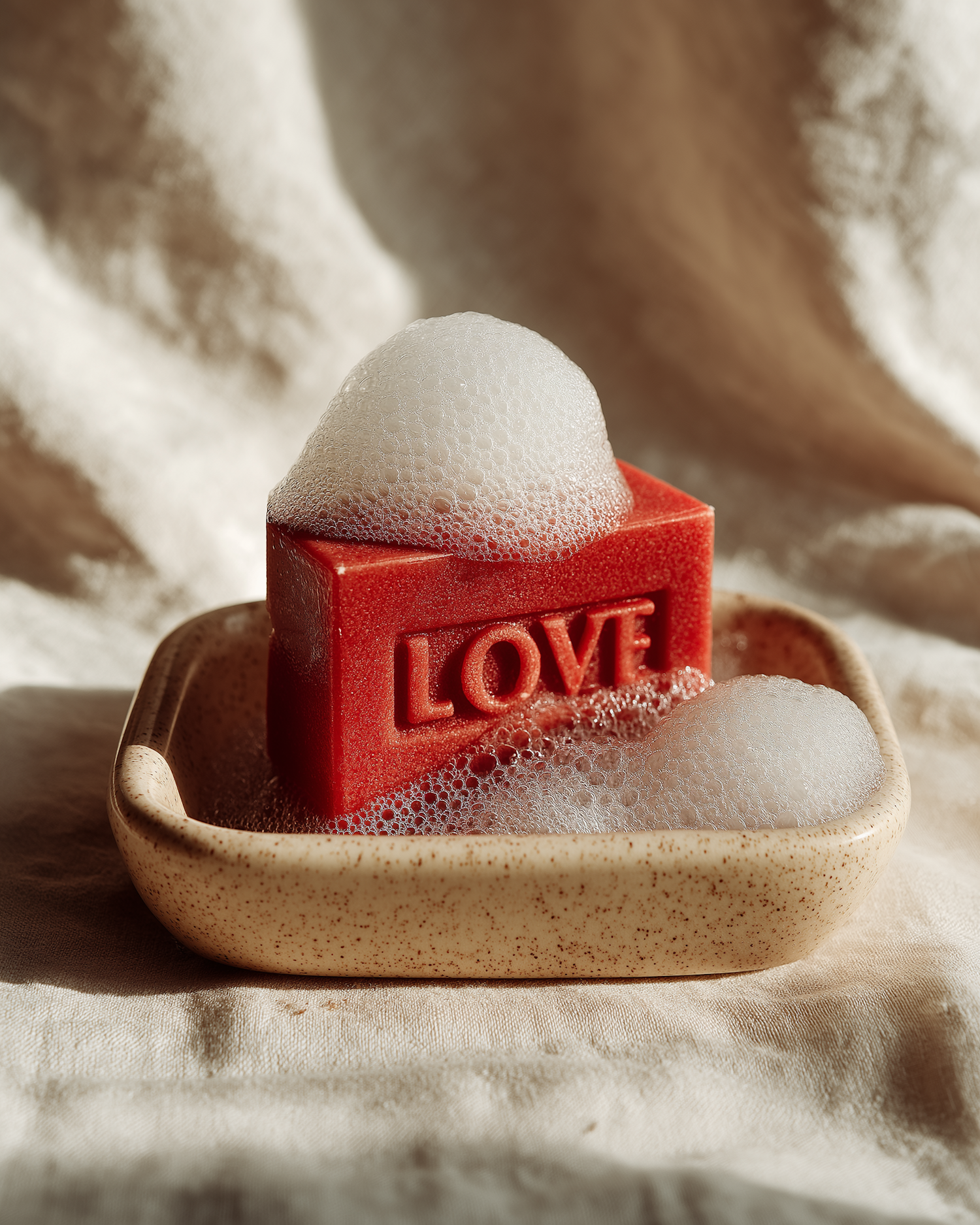 A red soap bar with 'LOVE' embossed, covered in foam, in a beige dish on a textured fabric background, softly lit for a cozy feel.