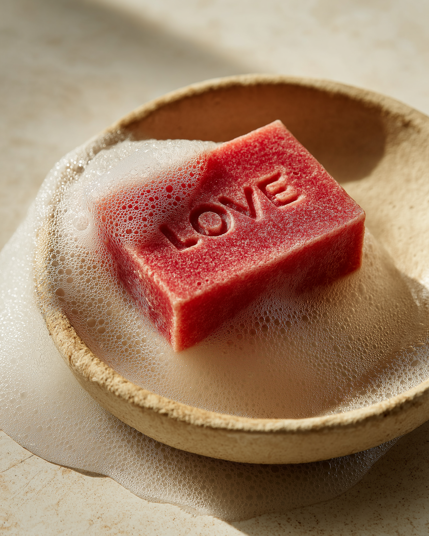 A red soap bar with 'LOVE' engraved, surrounded by frothy bubbles in a beige dish, creating a clean and refreshing aesthetic.