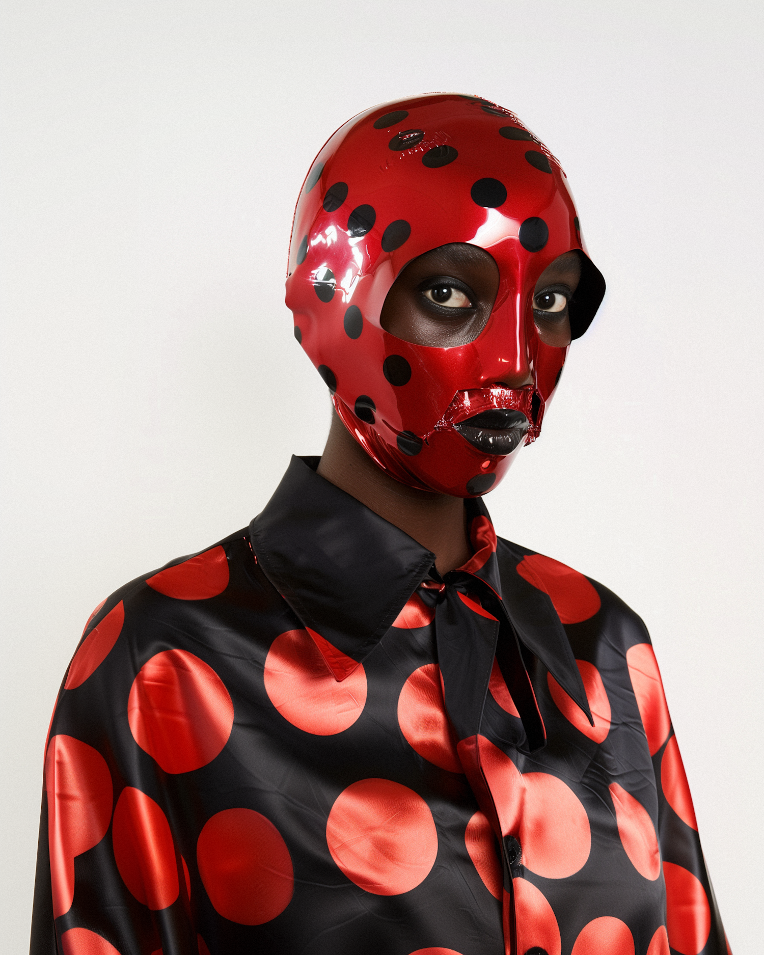 A person in a red and black polka dot mask and shirt, creating a bold and striking fashion statement.