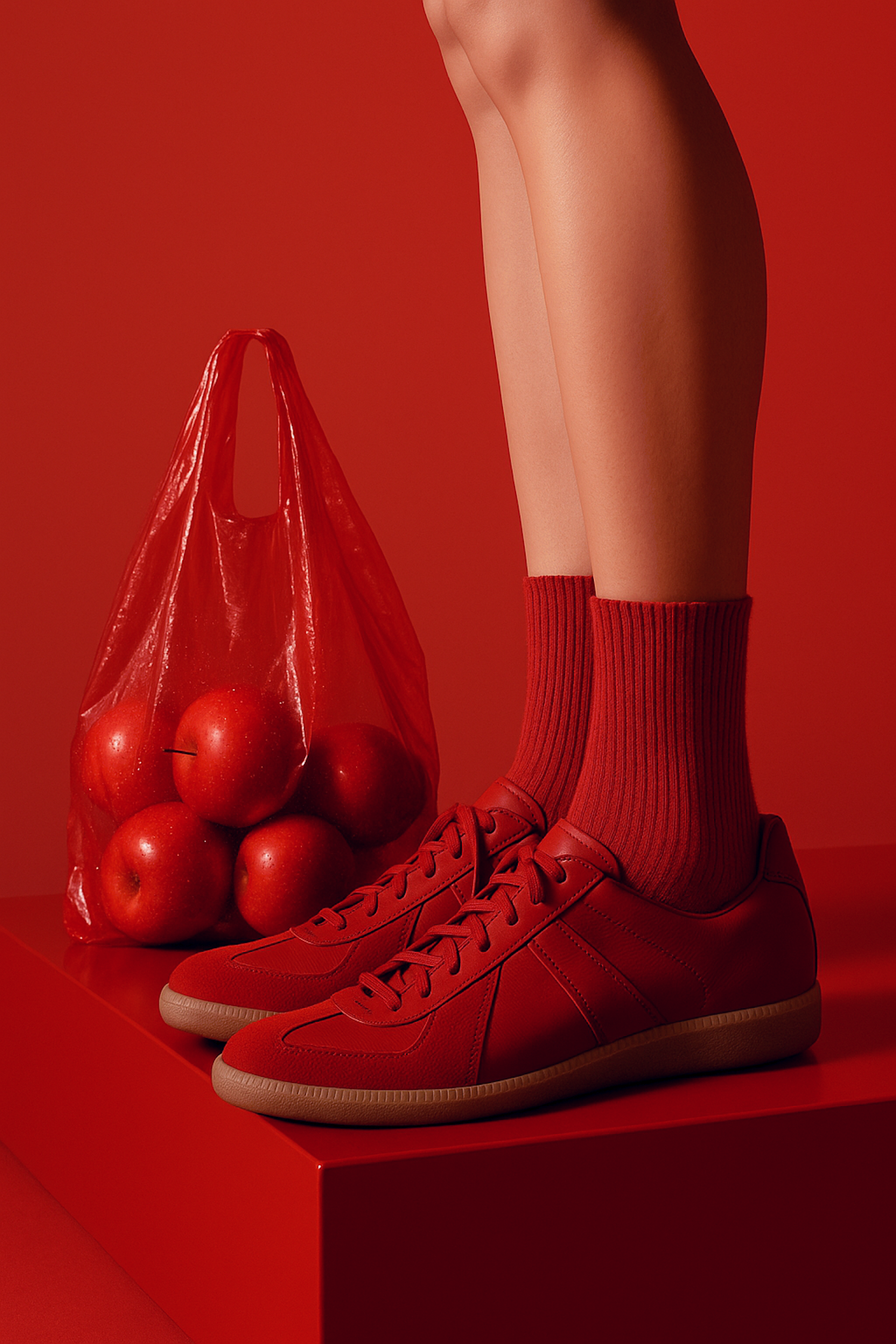 Bold red sneakers paired with matching socks and a bag of apples in a striking monochromatic red setting.