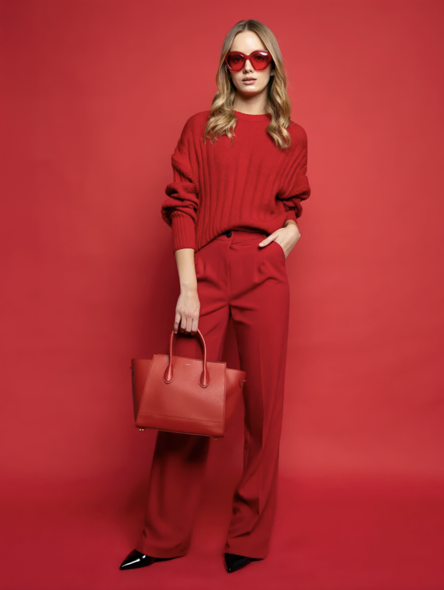 Stylish woman in a bold red outfit with matching accessories, standing against a red background. Perfect monochromatic fashion inspiration.