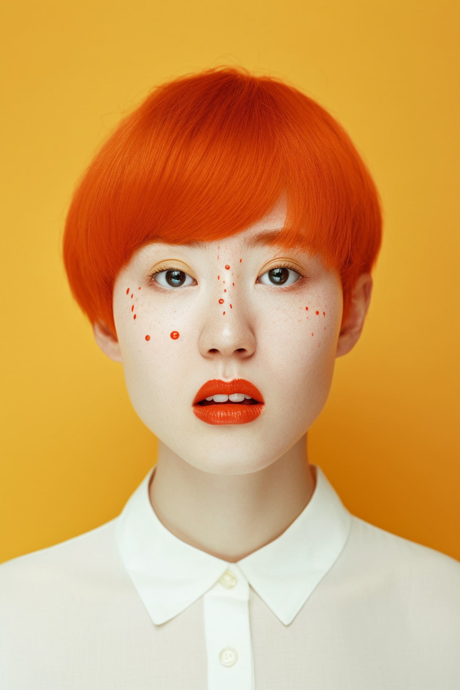Striking portrait of a woman with orange hair and artistic makeup against a yellow background, wearing a white collared shirt.