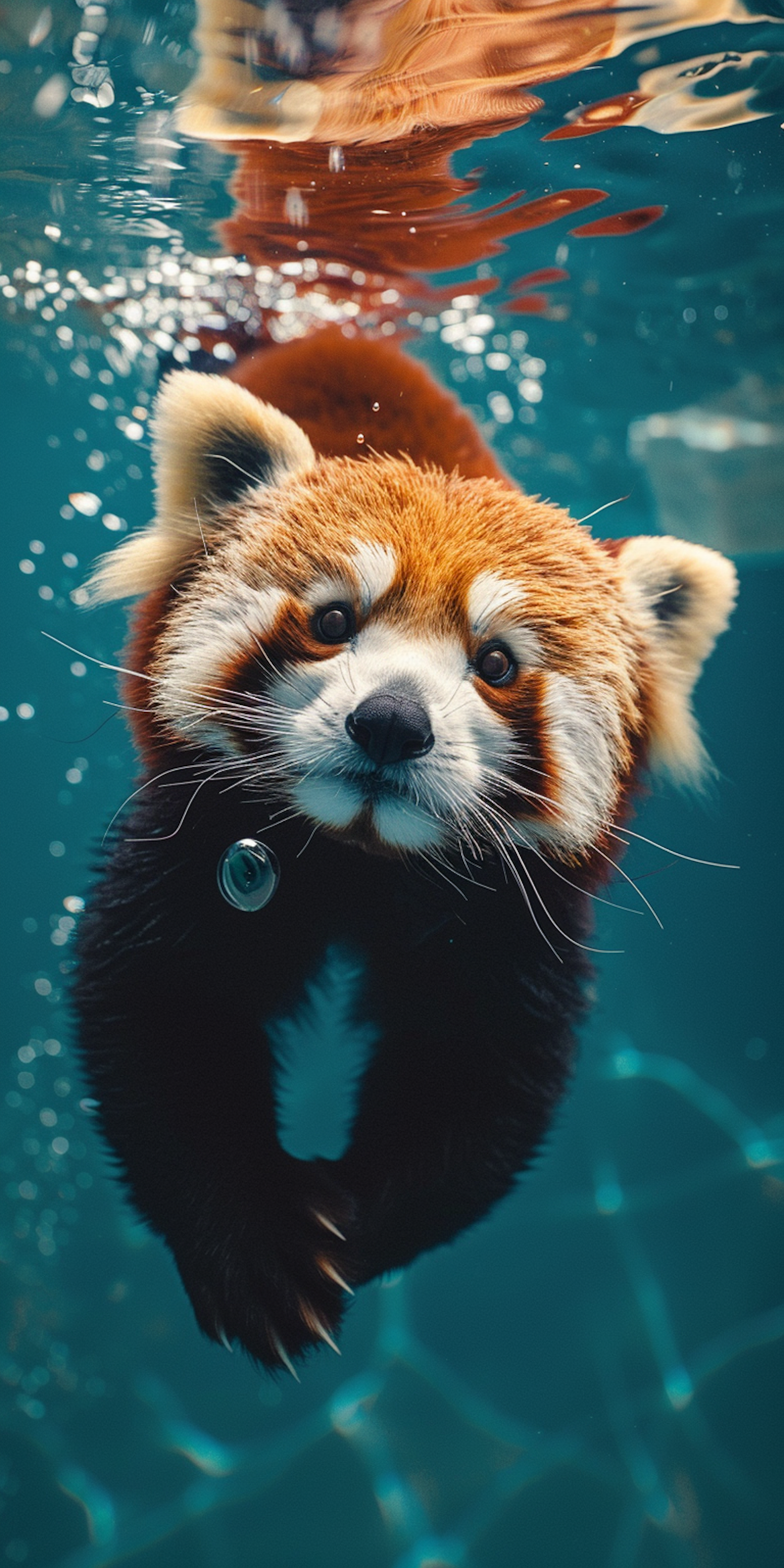 A red panda swimming underwater, showcasing its vibrant fur and playful expression in clear blue water.
