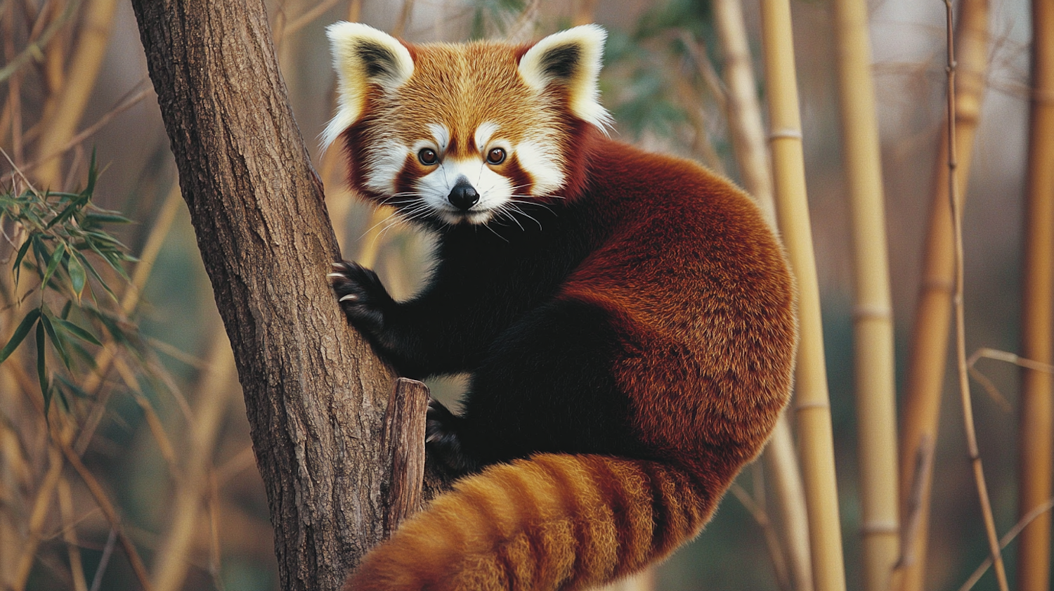 A curious red panda perched on a tree in a bamboo forest, showcasing its vibrant fur and bushy tail with striking facial markings.