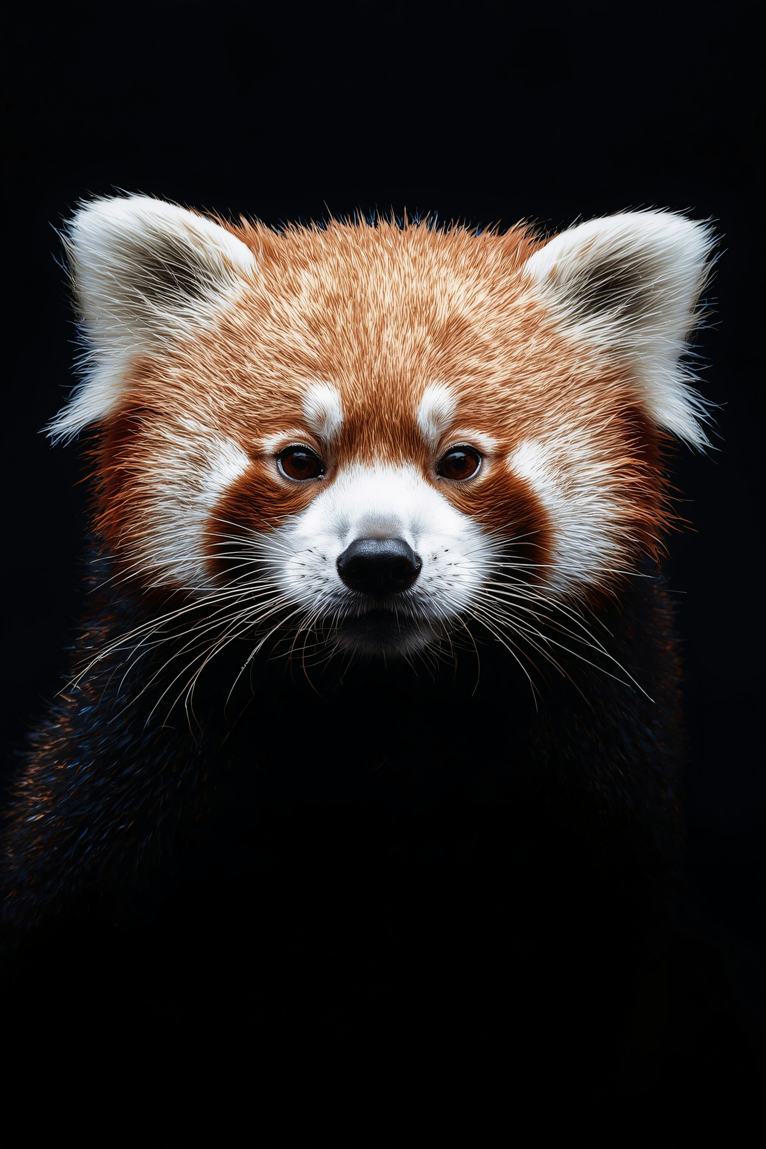 A close-up of a red panda's face with detailed fur texture and expressive eyes, set against a dark background for dramatic contrast.