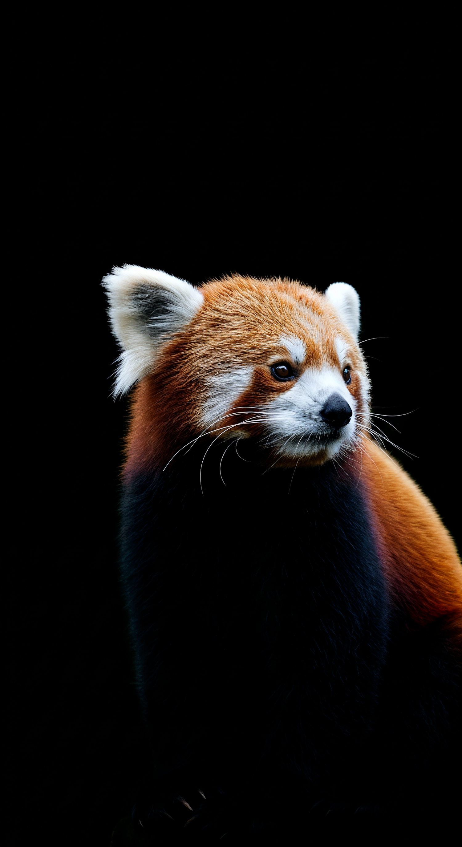 A close-up of a red panda with vibrant fur and expressive eyes, set against a black background for a striking and detailed look.