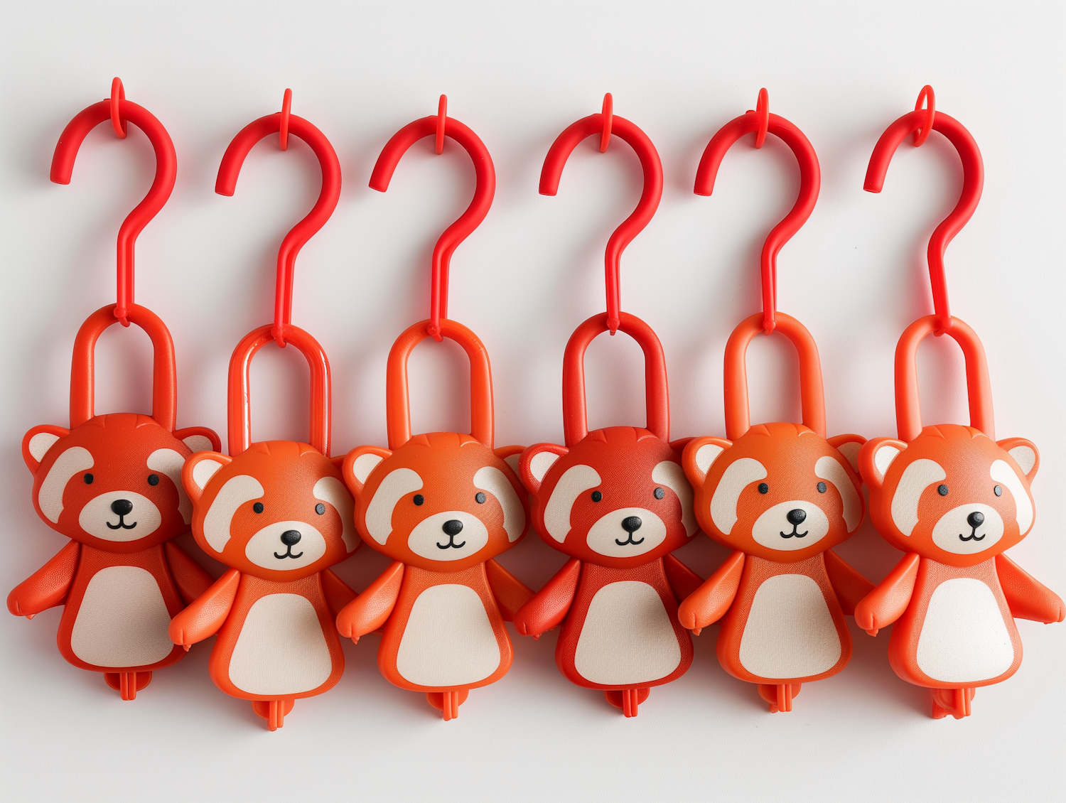 Six cute red panda-shaped hangers with vibrant red hooks, arranged in a neat row against a white background.