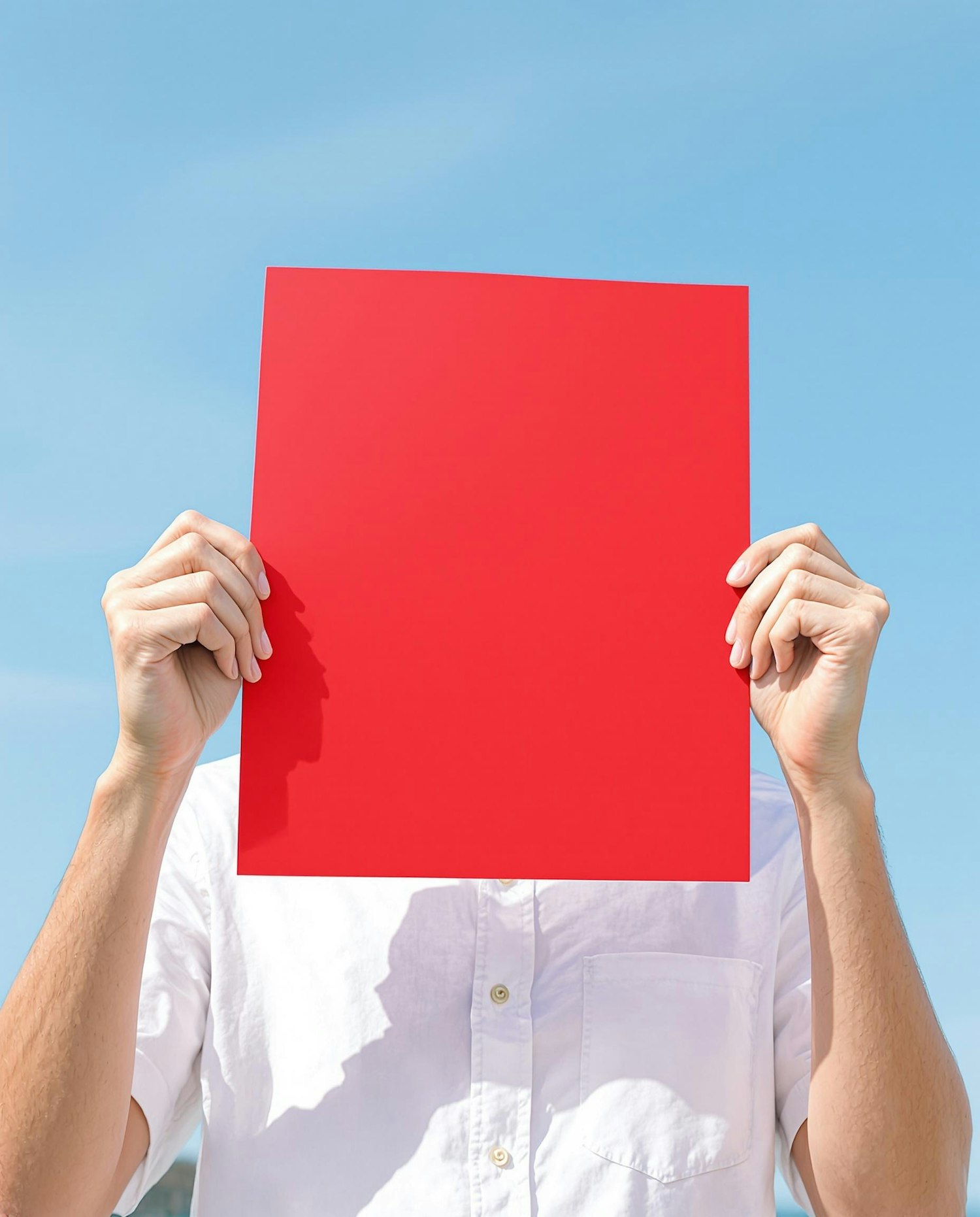 A lifestyle image showing a person holding a folded blank poster (A2 format) in front of their face, standing against a bright blue sky. The person wears a white shirt. The poster is red with a large white border, but no text or branding. Clean shadows and summer ambiance.