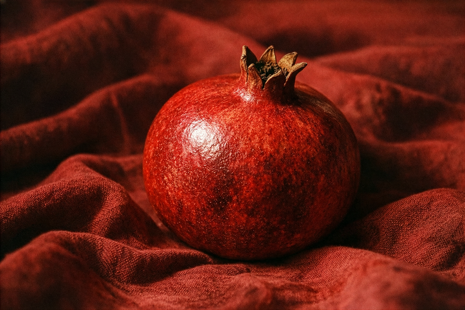 A vibrant red pomegranate on a textured red fabric background, showcasing its glossy surface and natural beauty.