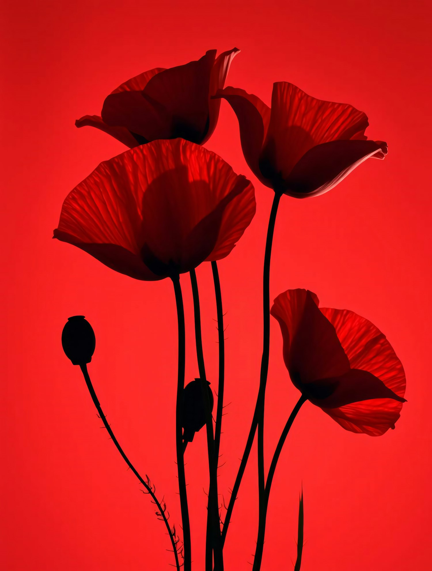 Silhouetted red poppy flowers with glowing petals against a vivid red background, creating a dramatic and artistic composition.