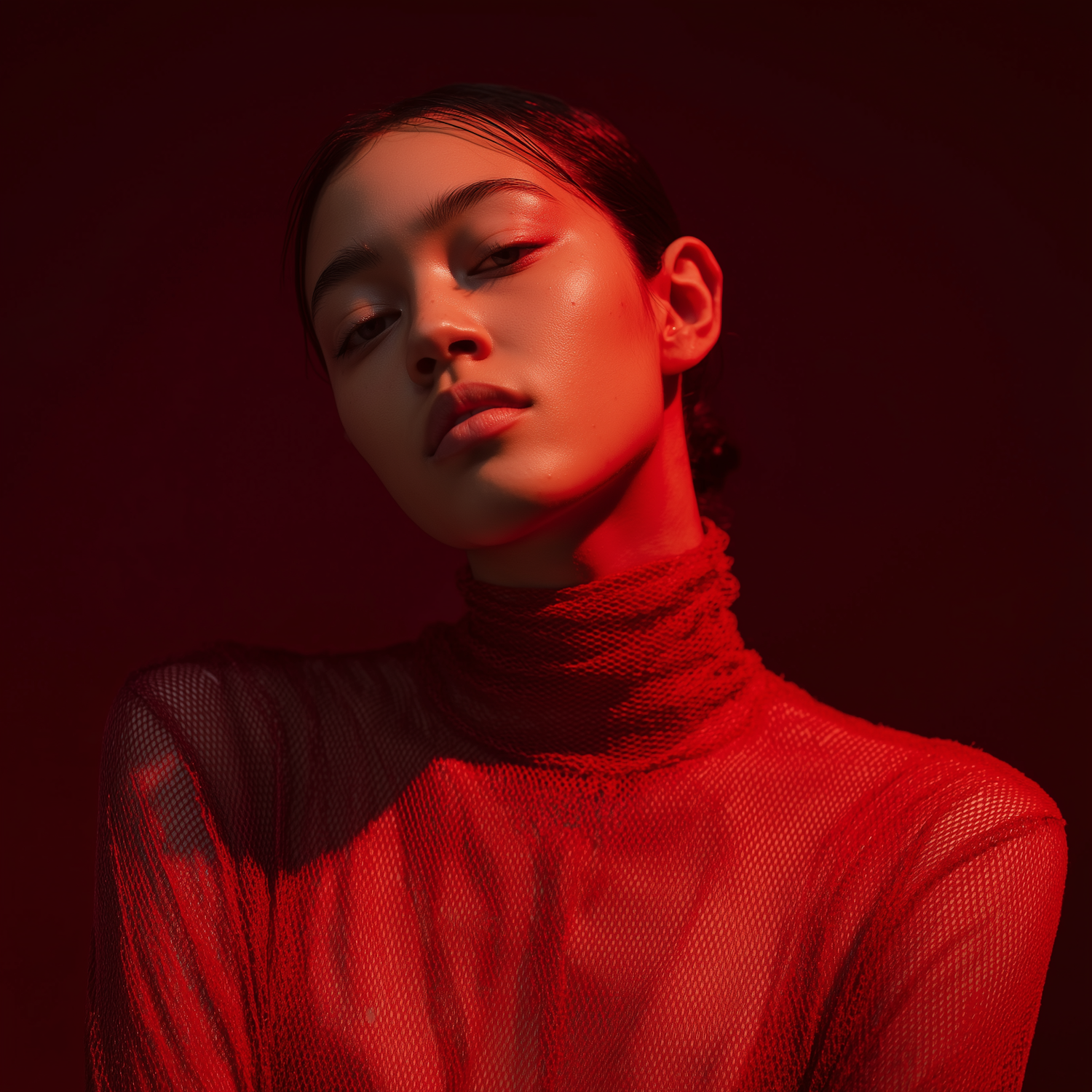Striking portrait of a person in red lighting, wearing a high-necked mesh top, with a deep red background creating a dramatic effect.