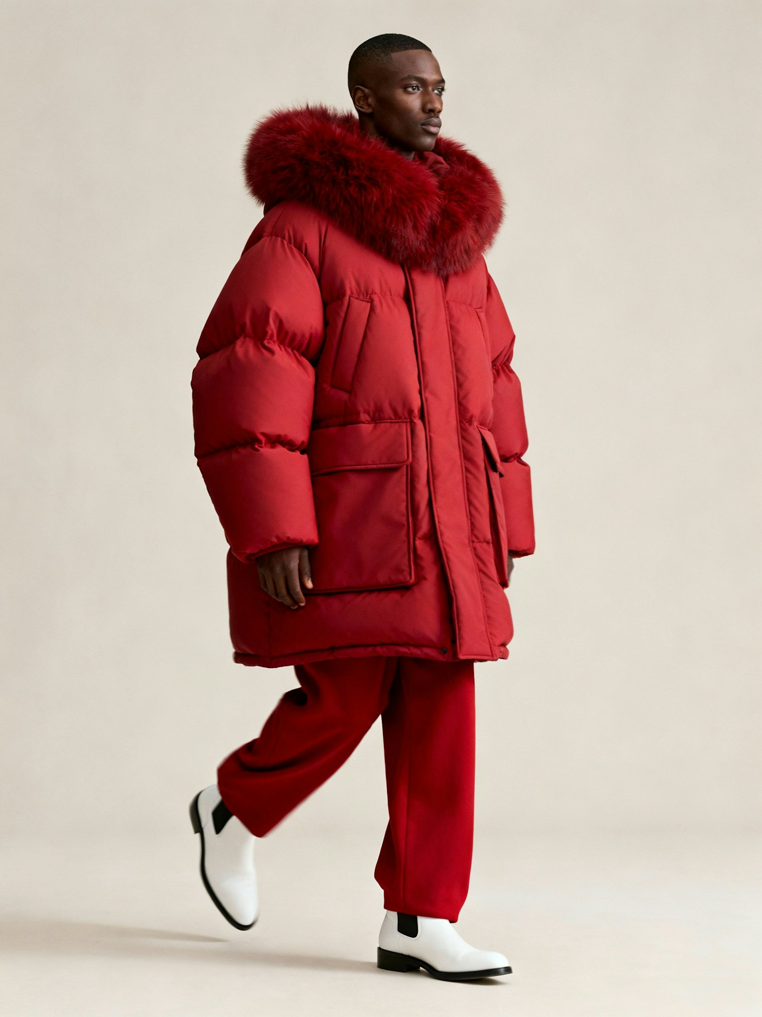 A close-up editorial portrait of a poised Black man wearing an oversized red puffer coat with a voluminous fur collar, large sleeves, and deep pockets. with a skin fade haircut, he pairs it with loose-fitting red pants and white Chelsea boots. The framing is tight, emphasising his glowing, hyperrealistic skin and serene expression. The monochromatic outfit contrasts beautifully with his rich brown skin tone, while the plain backdrop and soft, diffused lighting highlight texture, volume, and mood. The overall aesthetic is minimalist, winter-forward, and quietly powerful. with a full body motion blur of him walking