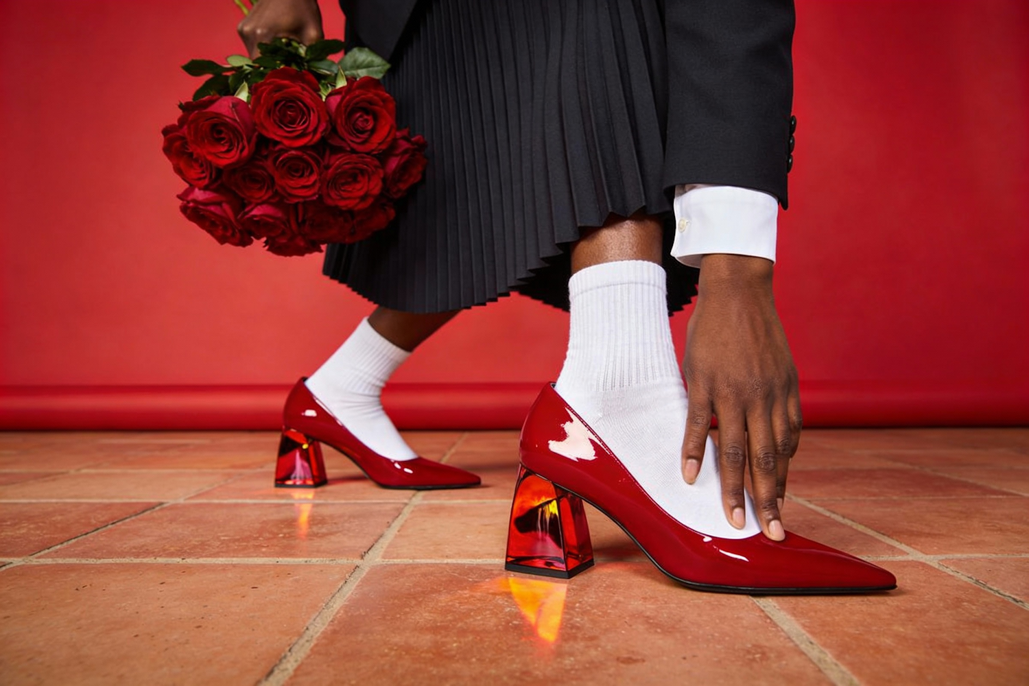 Stylish red heels with transparent block heels paired with white socks, a bouquet of red roses, and a bold red background.