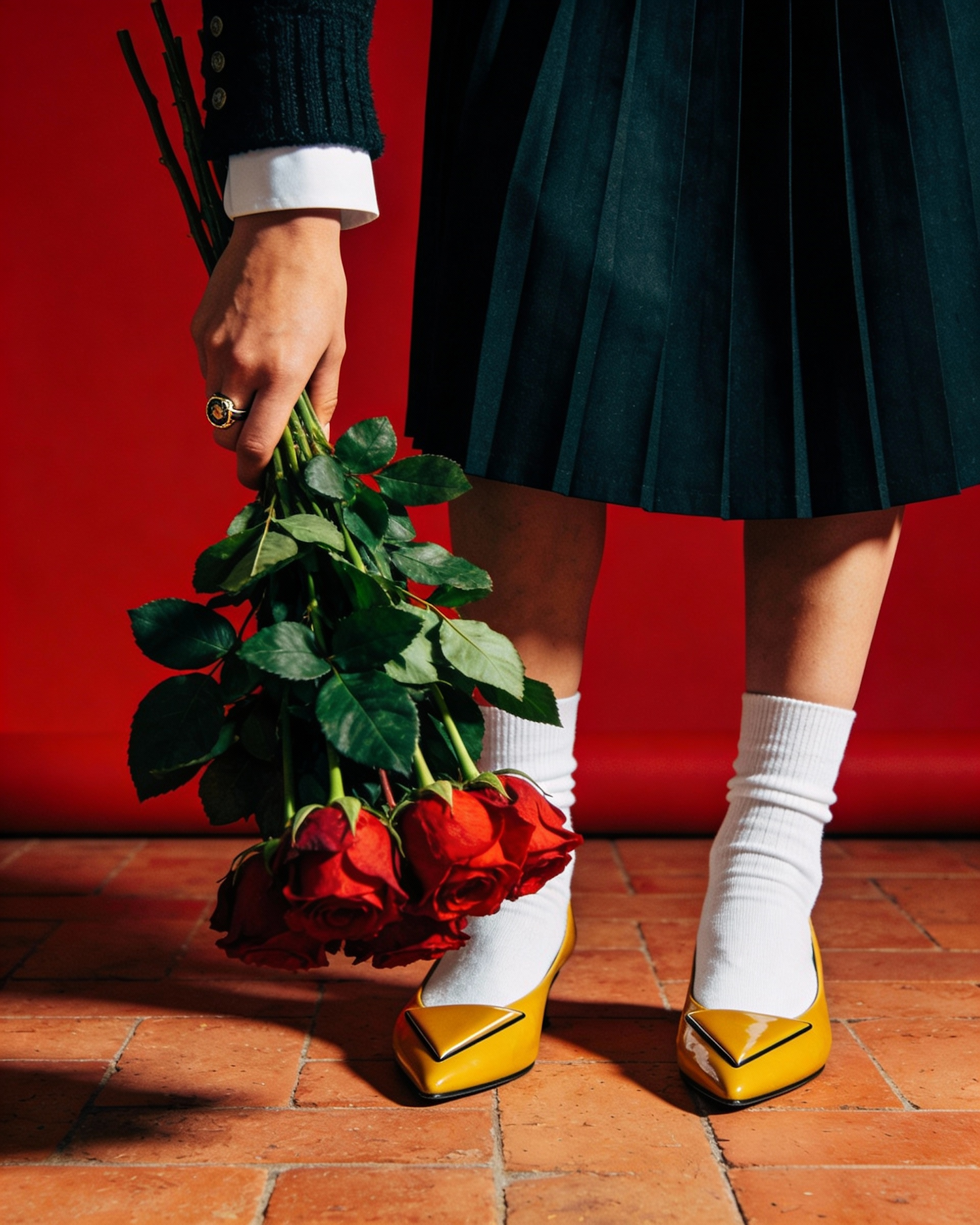 A cropped editorial portrait capturing the lower half of a person standing against a vivid red backdrop. They hold a bouquet of deep red roses with lush green leaves in their left hand, fingers adorned with a single ring. Their outfit features a dark pleated skirt and crisp white socks paired with stylish yellow triangle‑toe shoes with a glossy finish, adding a bold, modern twist. The shoes stand out sharply against the terracotta‑toned floor tiles beneath them, creating a chic contrast in texture and colour. A white shirt cuff peeks from beneath a structured dark jacket or sweater, adding a tailored detail. The composition is tightly framed to emphasise gesture, footwear, and the interplay of red, green, and earthy tones. The overall mood is cinematic and fashion‑forward, blending romance with contemporary edge.