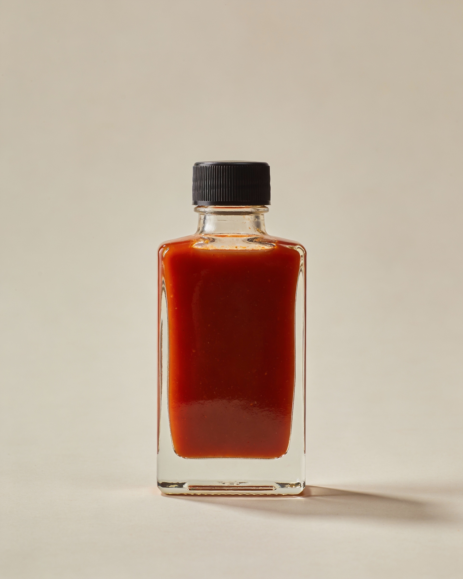 A clear glass bottle with a black cap, filled with rich red sauce, set against a neutral background with soft lighting.