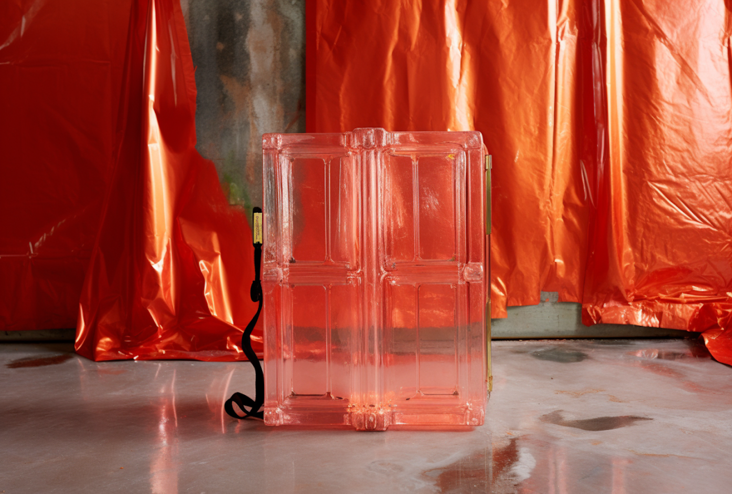 Transparent pink suitcase with black strap against vibrant orange fabric backdrop on polished concrete floor.