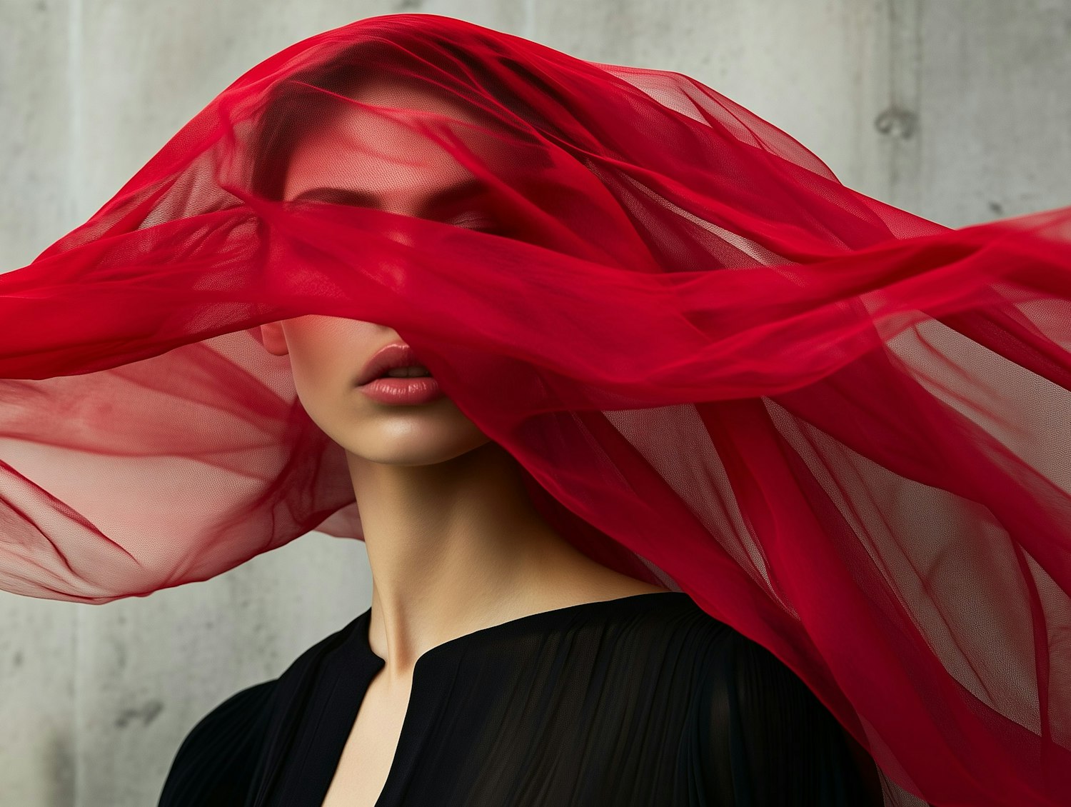 Mysterious portrait with red sheer fabric covering eyes, contrasting with black attire. Elegant and captivating visual composition.