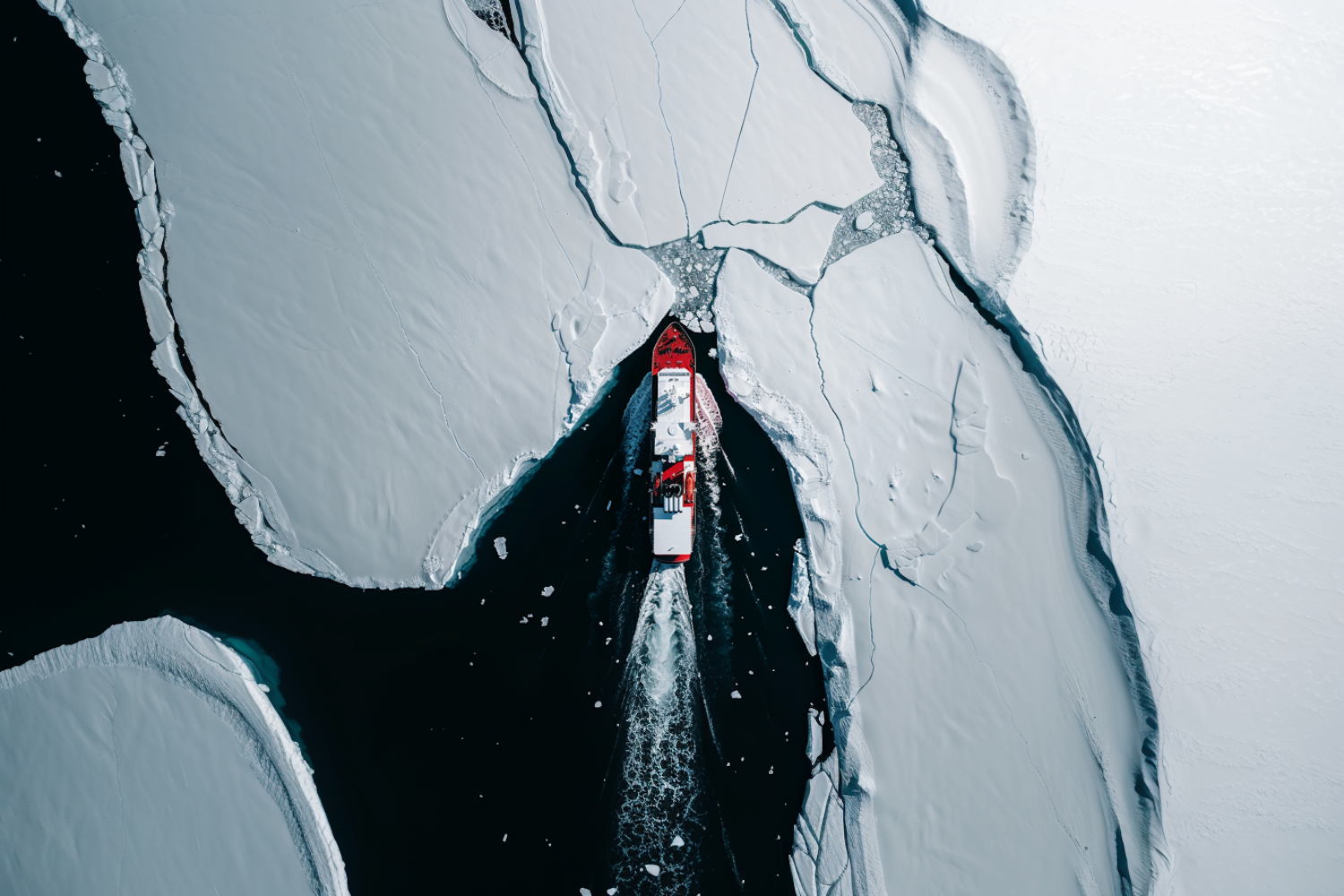 A red icebreaker ship cuts through vast sheets of ice, creating a striking contrast against the frozen polar landscape.