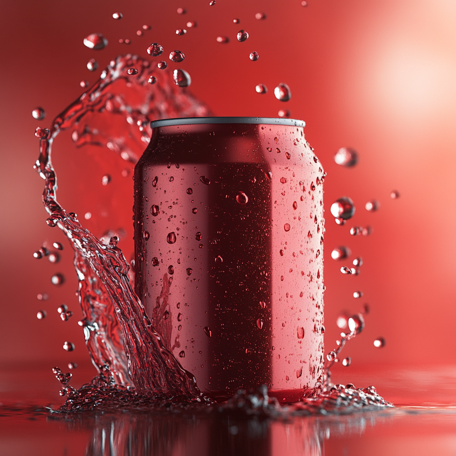 Dynamic splash around a red soda can against a matching background, capturing motion and freshness.