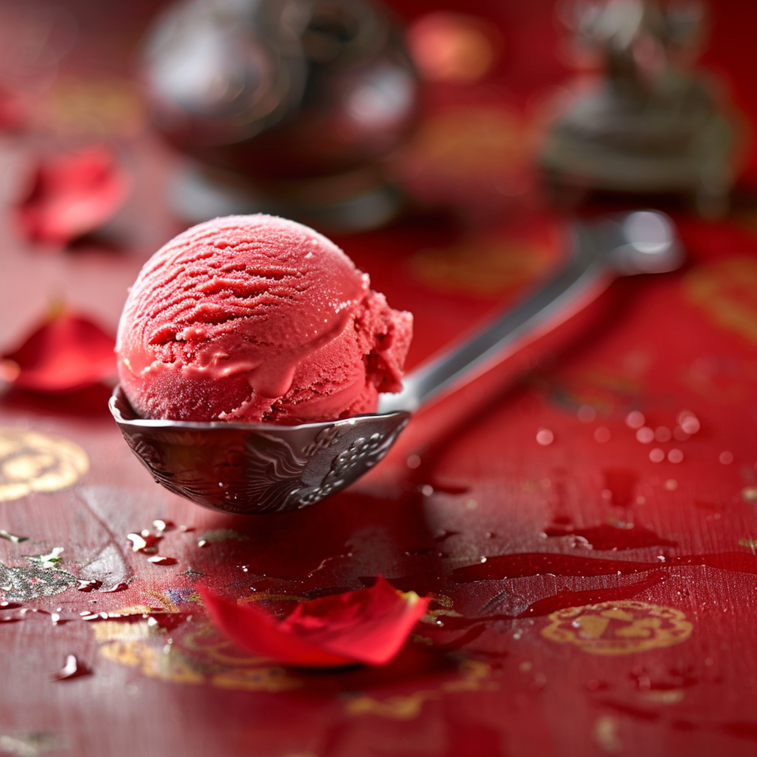 Vibrant red ice cream scoop in a decorative spoon on a luxurious red and gold background with rose petals.