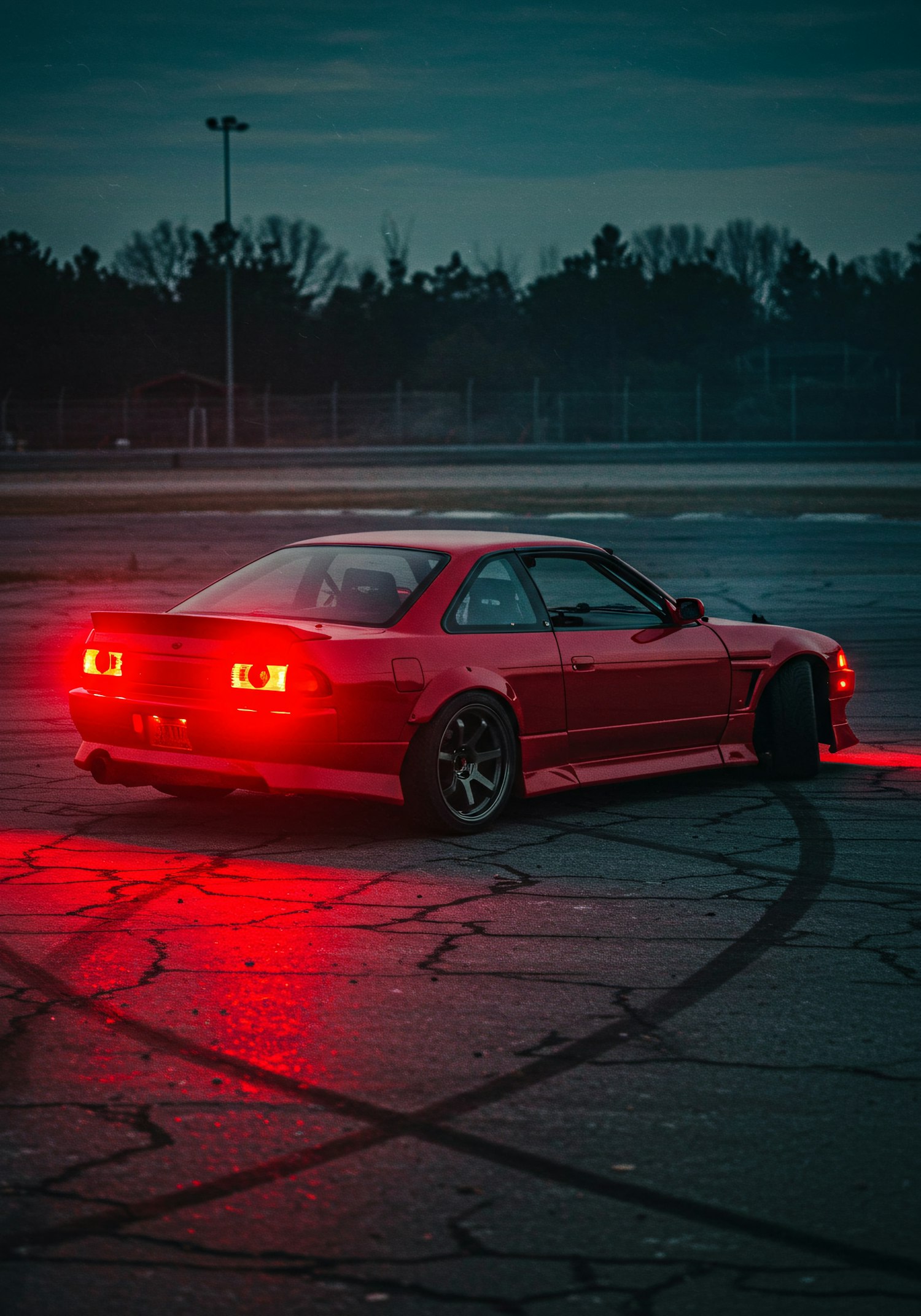 A red sports car with glowing taillights on a cracked asphalt surface at dusk, showcasing its sleek, modified design.