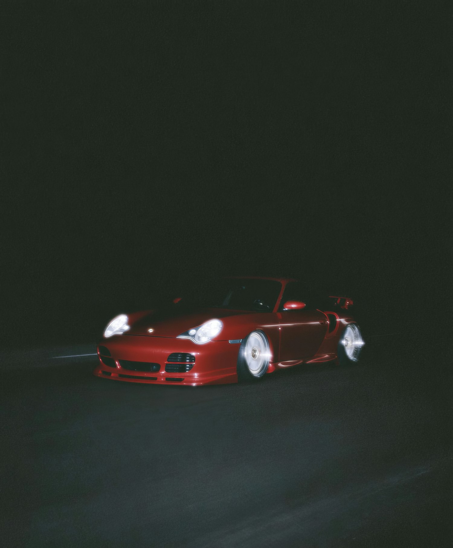 A red sports car in motion at night, with glowing headlights and spinning wheels, creating a dynamic and sleek visual.