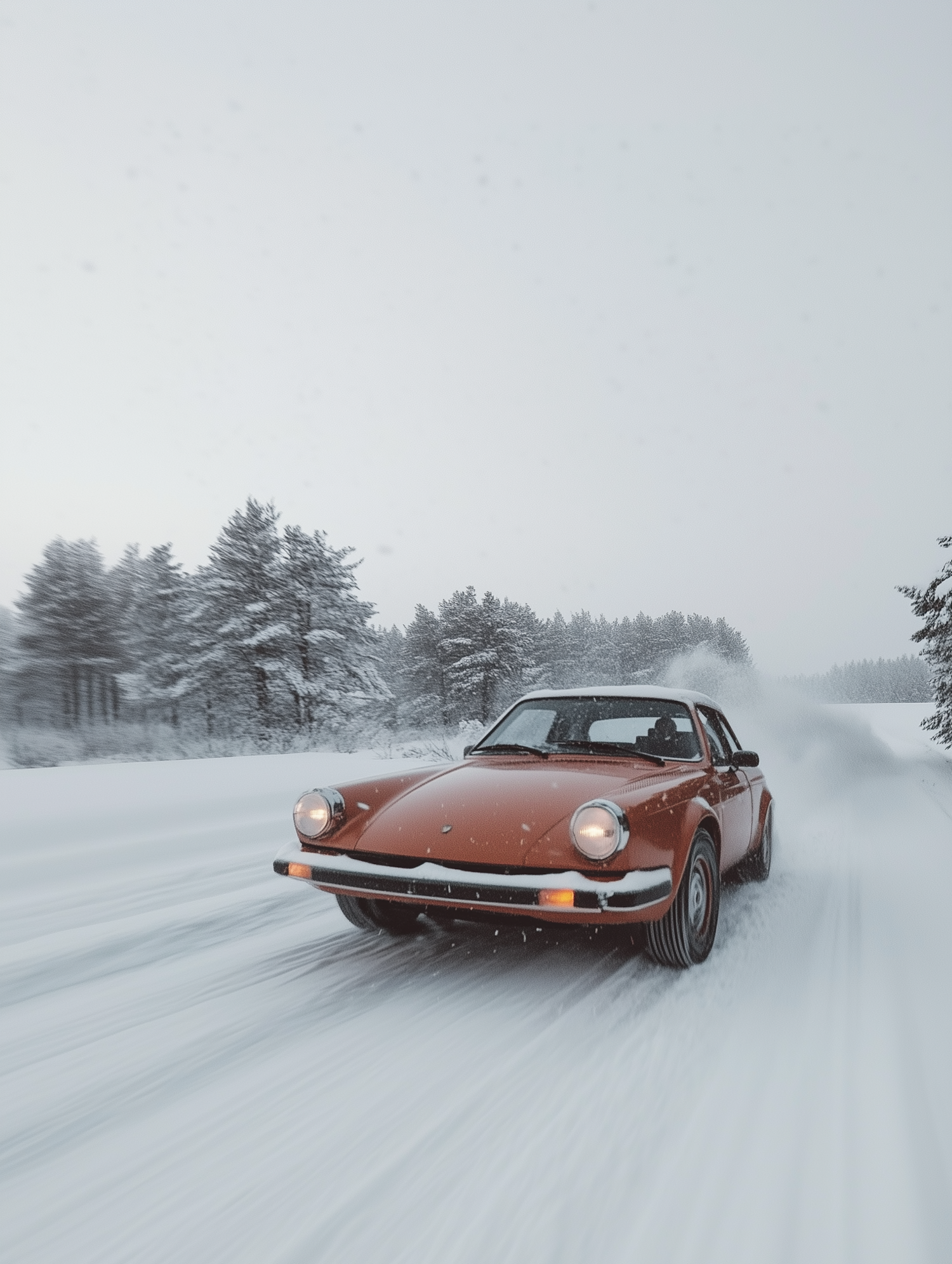 Classic red sports car driving through snowy landscape, headlights on, snow flying, surrounded by snow-covered trees.
