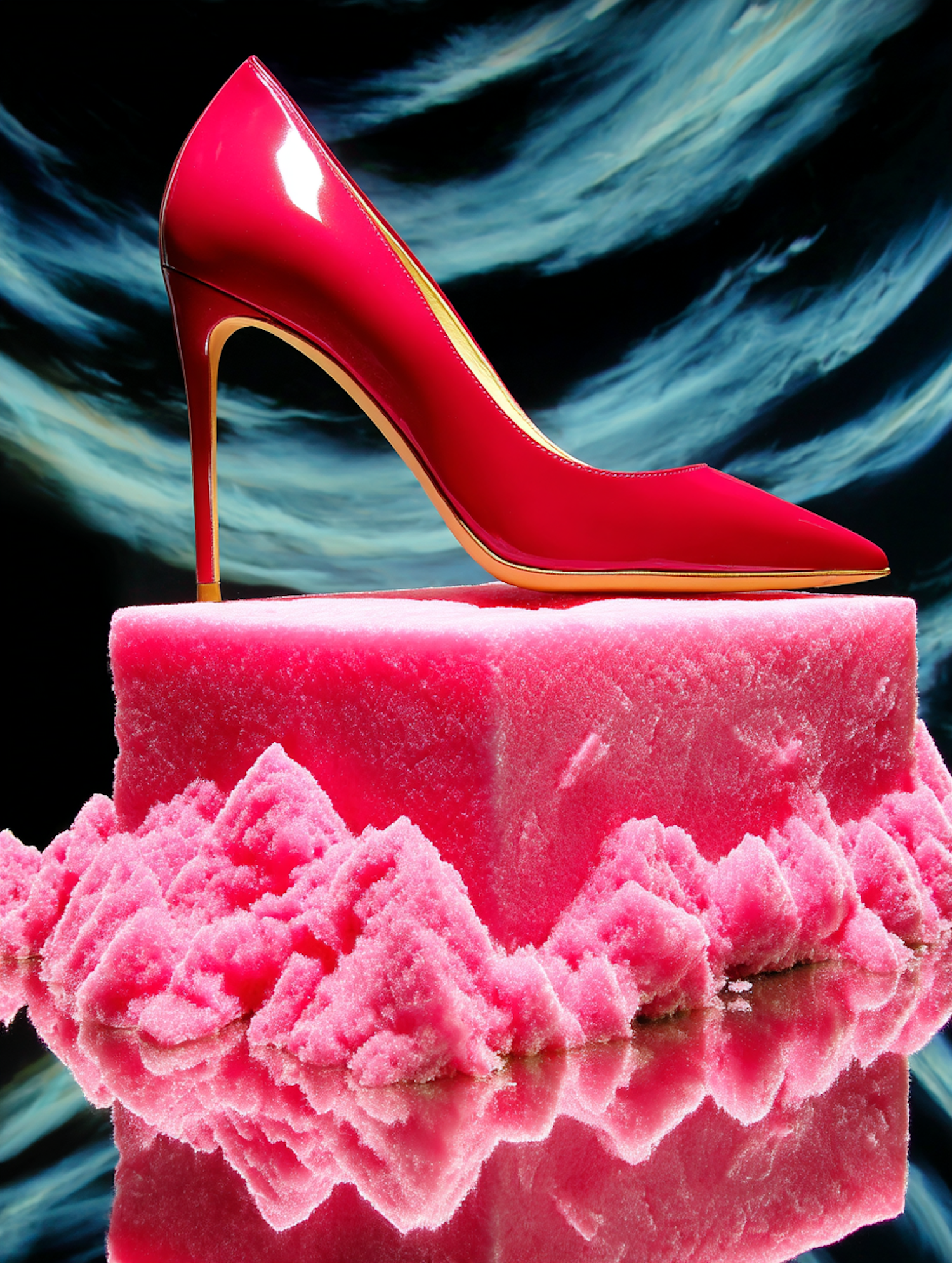 Glossy red stiletto on a textured pink block with a swirling blue-black background, blending fashion and surrealism in a bold composition.