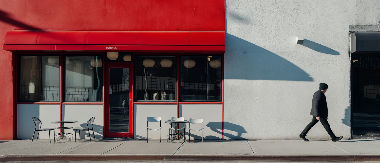 A man walks past a red storefront with outdoor seating, casting a shadow on a sunny day.
