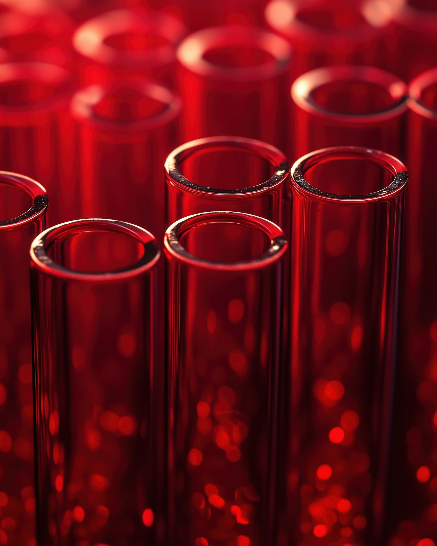 Close-up of glass test tubes glowing under red light, creating a dramatic and scientific aesthetic with sharp focus on the rims.