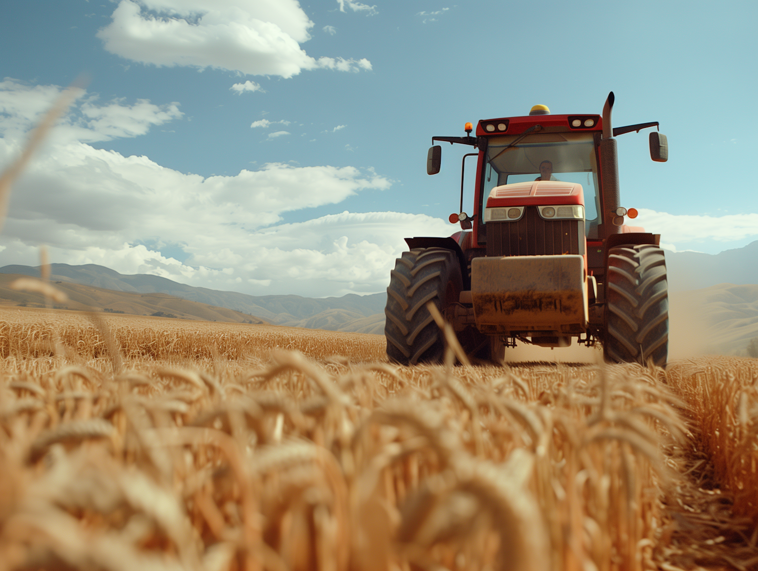 Red tractor plowing through a golden wheat field under a bright blue sky with fluffy clouds, set against rolling hills.