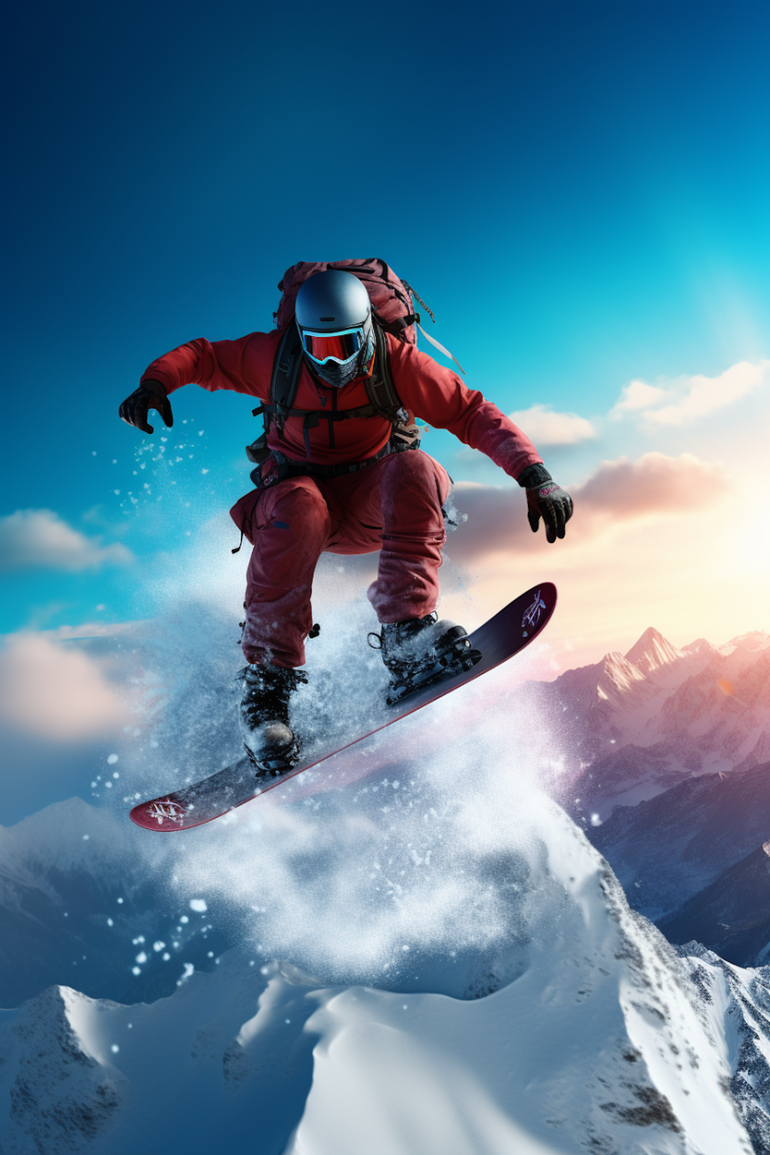 Snowboarder in red gear jumps over snowy peak with sunset backdrop, showcasing adventure and skill.