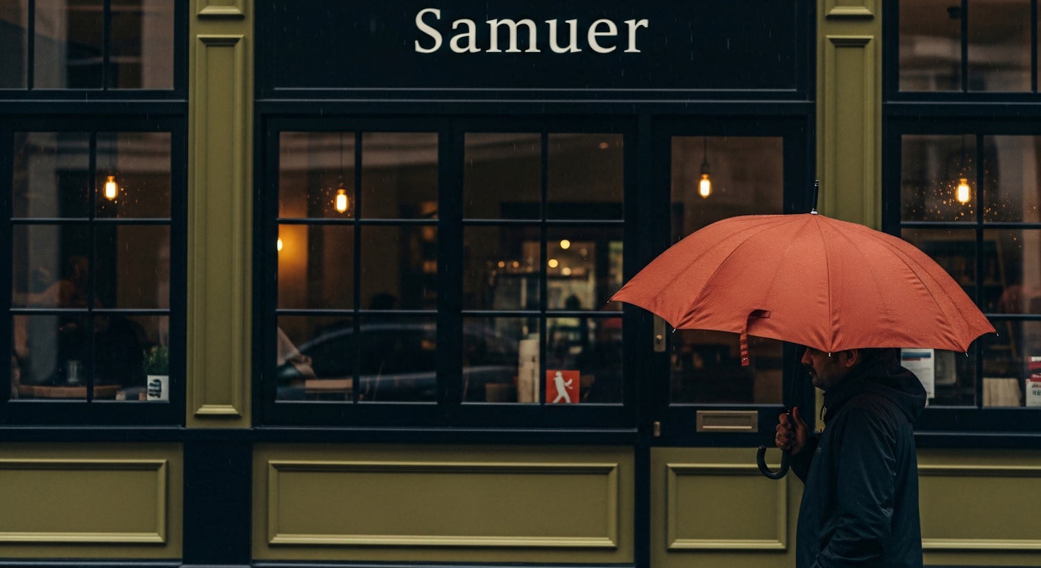 A person with a red umbrella walks past a stylish storefront named 'Samuer,' featuring green and black tones with warm interior lighting.