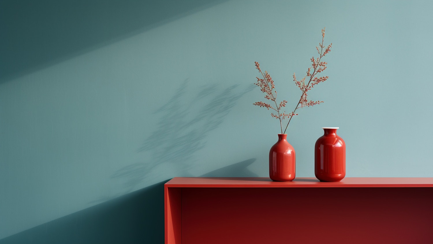 Minimalist decor with red vases on a red shelf against a teal wall, featuring a delicate branch and soft shadows.