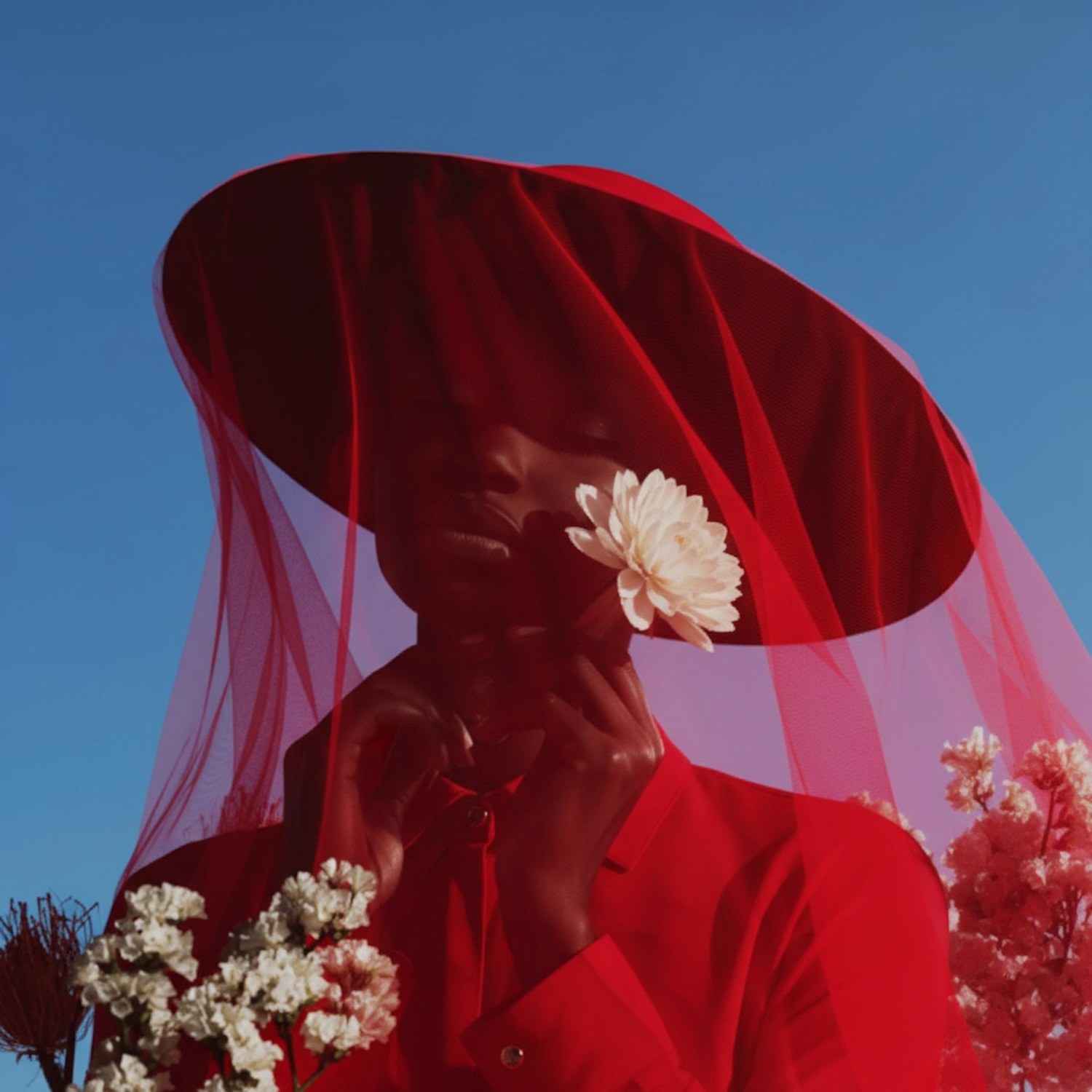 A person in a red outfit with a veil holds a white flower against a blue sky, creating a striking and artistic composition.