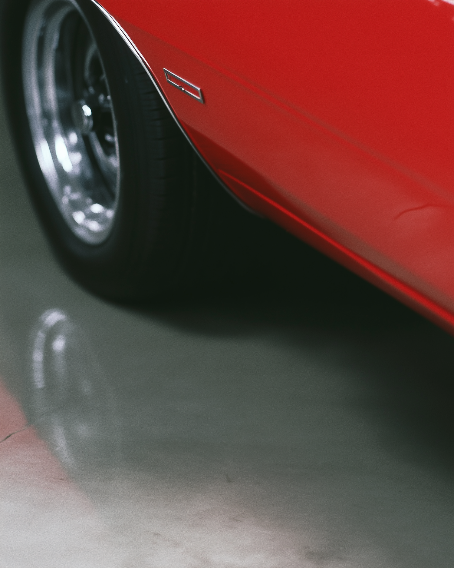 Close-up of a red vintage car's rear panel and chrome wheel, showcasing its glossy finish and classic design details.