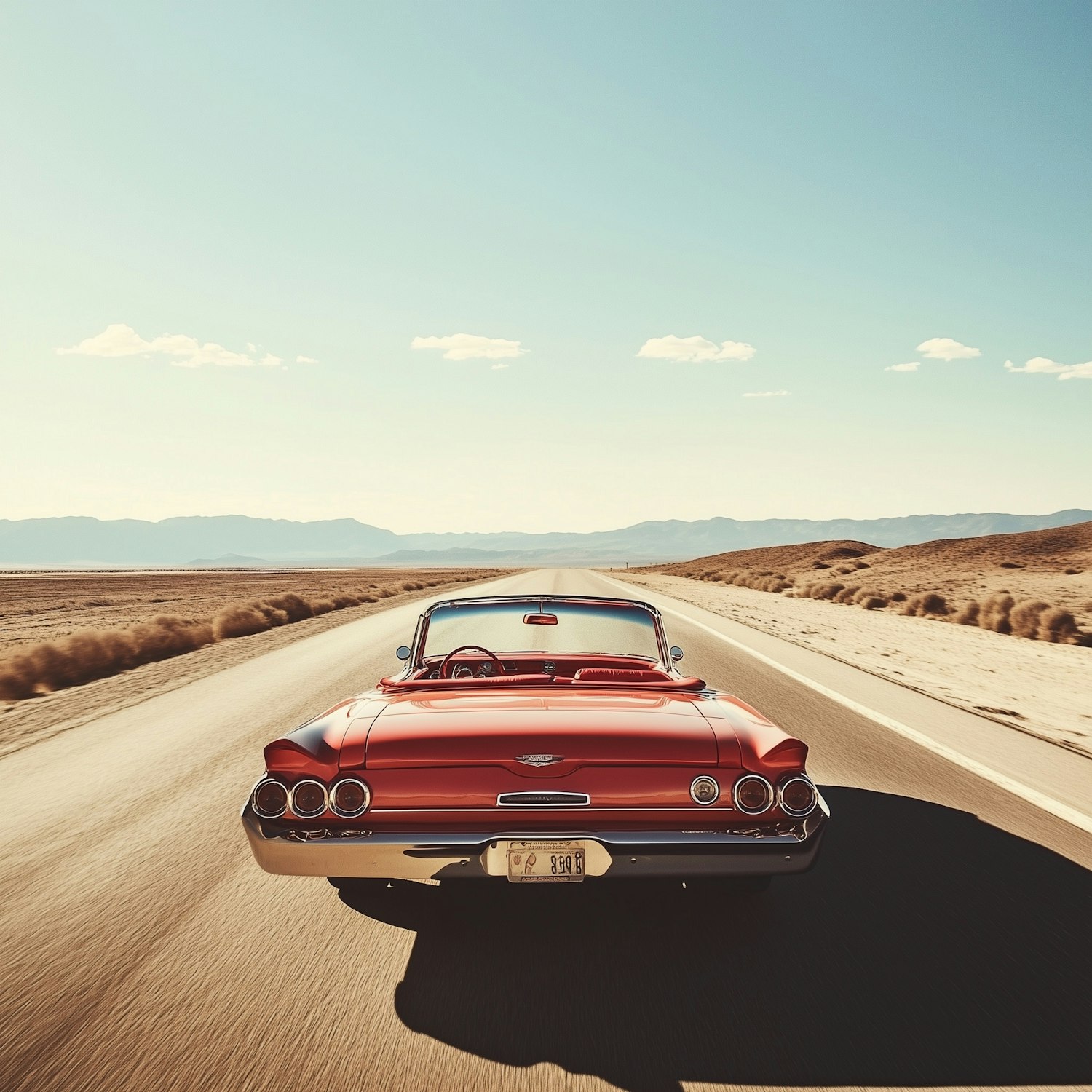 A red vintage convertible cruises down a desert highway under a clear blue sky, evoking freedom and adventure on an open road.