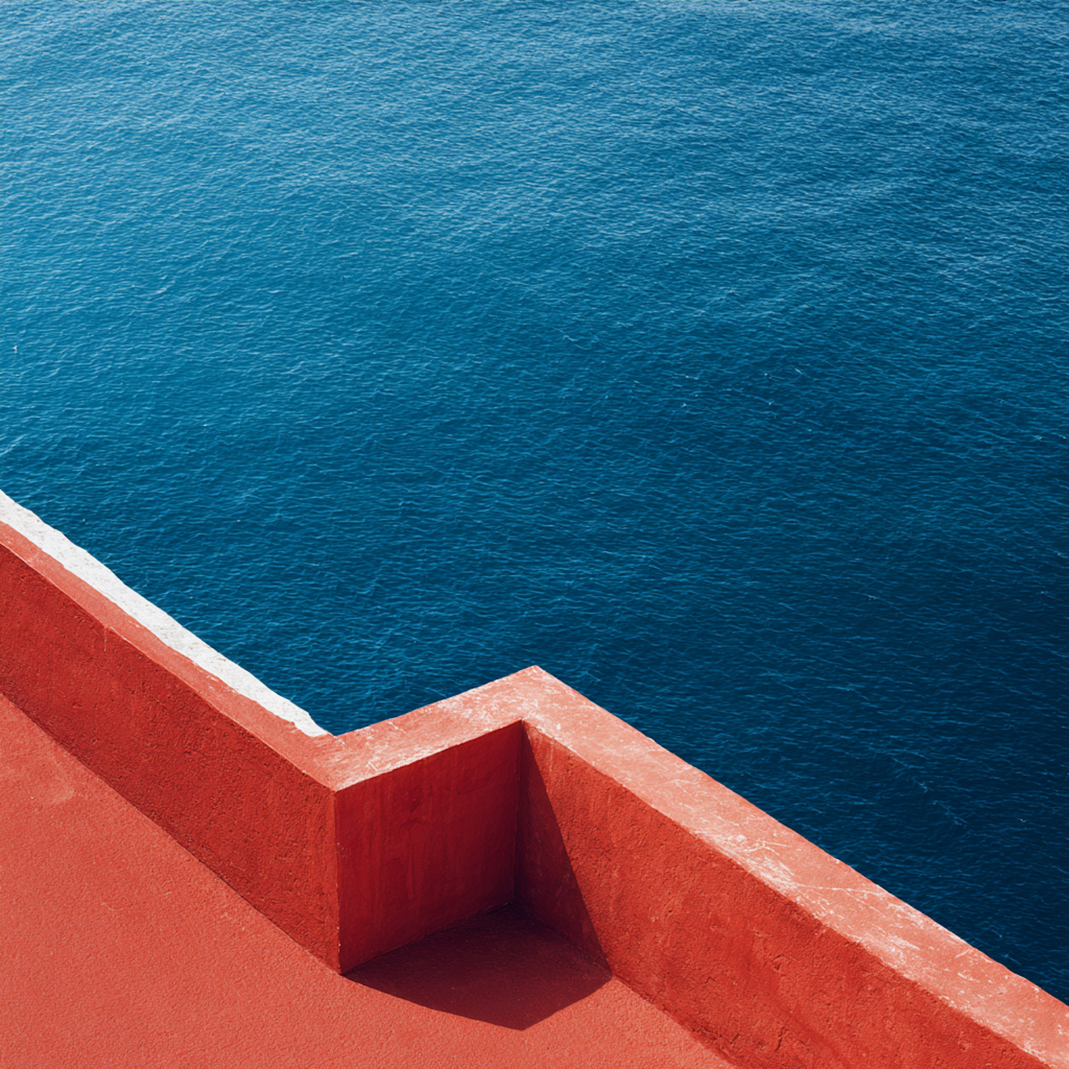 Minimalist view of a red wall with sharp angles contrasting against a vast, calm blue ocean. Striking colors and clean lines create a serene scene.