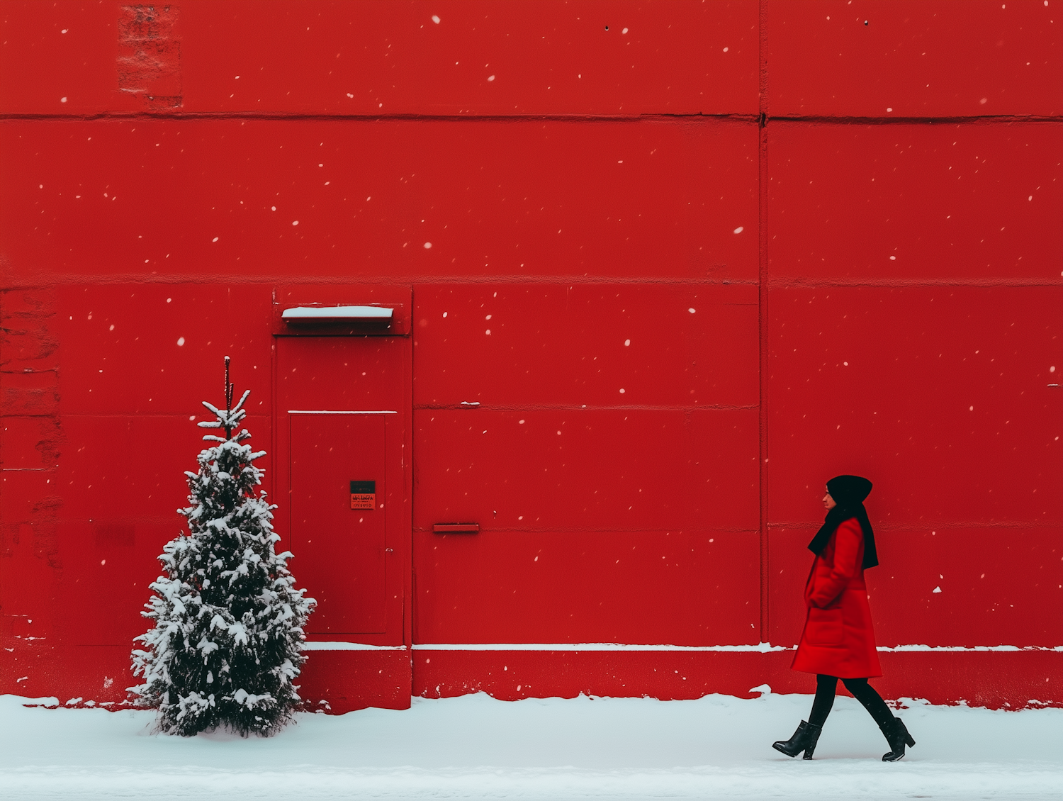 A person in a red coat walks by a snowy evergreen against a vibrant red wall, creating a striking winter contrast.