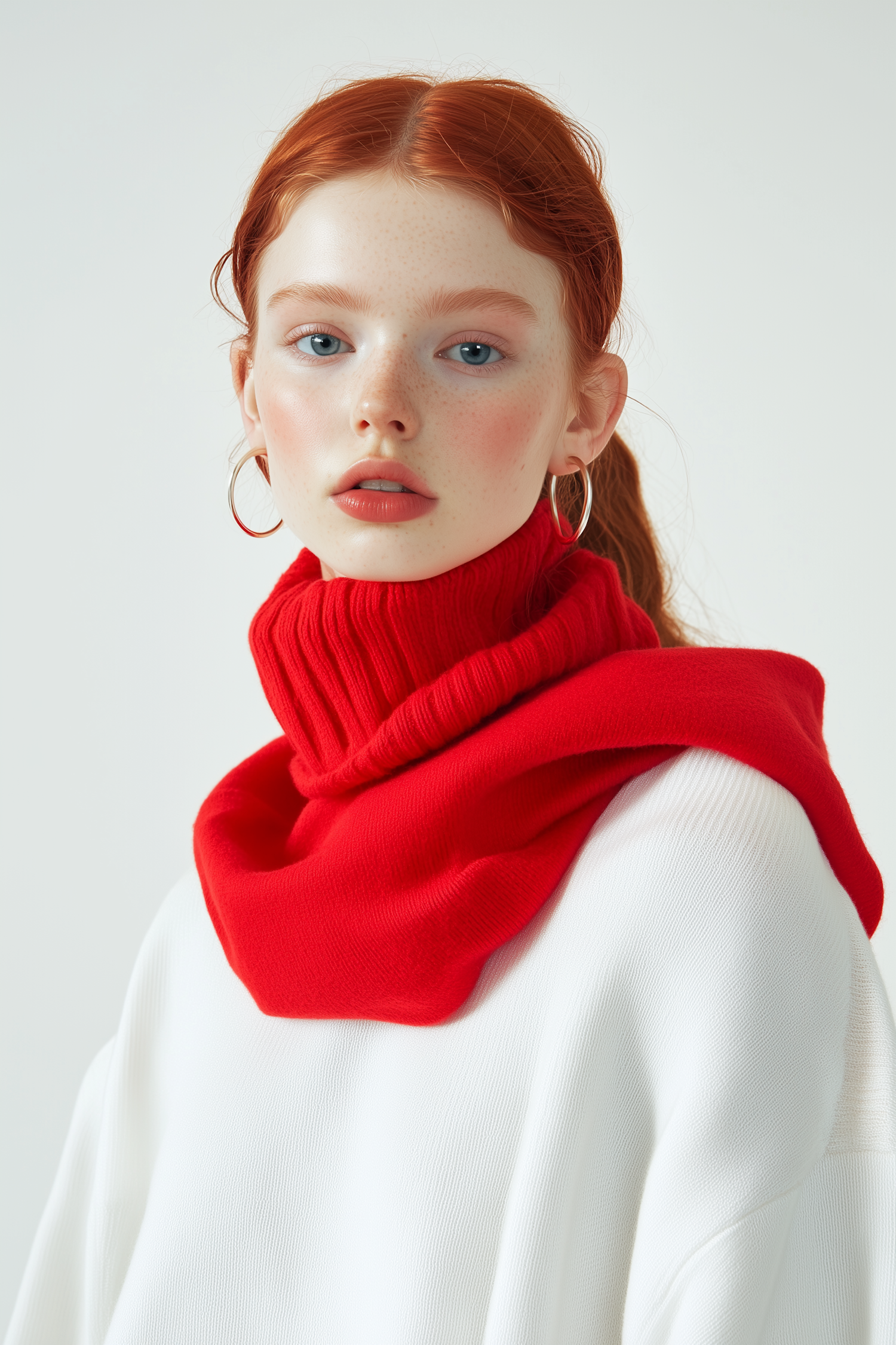 Freckled woman with red hair, blue eyes, and a bold red scarf paired with a white sweater. Minimal makeup and silver hoop earrings complete the look.